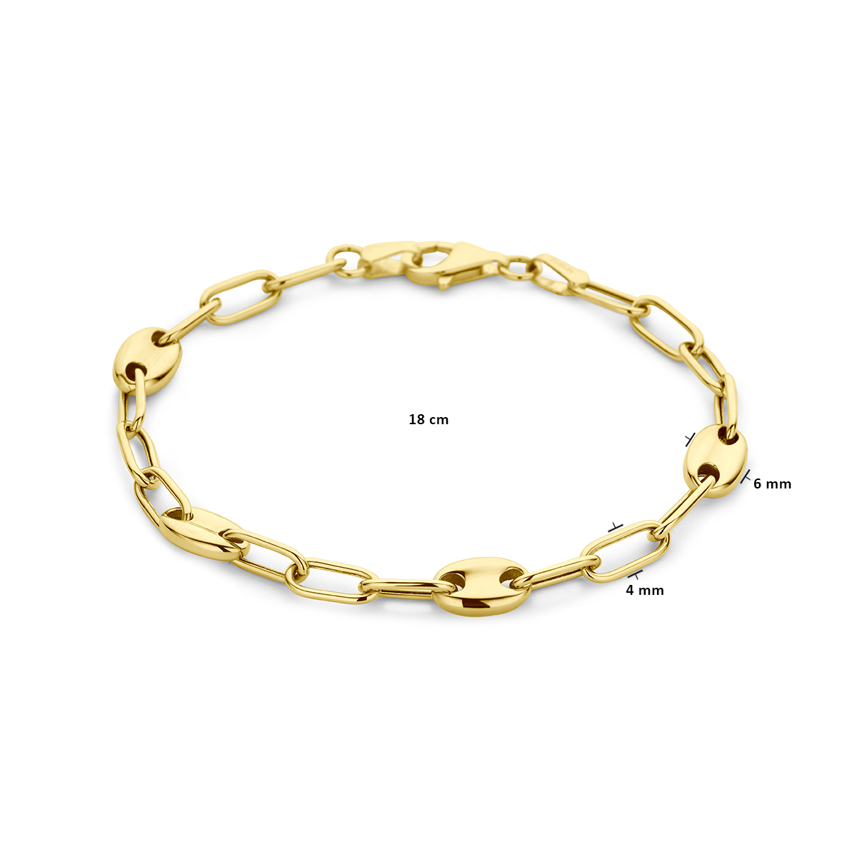 14k Geelgouden armband uitgevoerd met een karabijn sluiting. De armband heeft een draaglengte van 18cm. De schakelbreedtes zijn 4mm en 6mm.