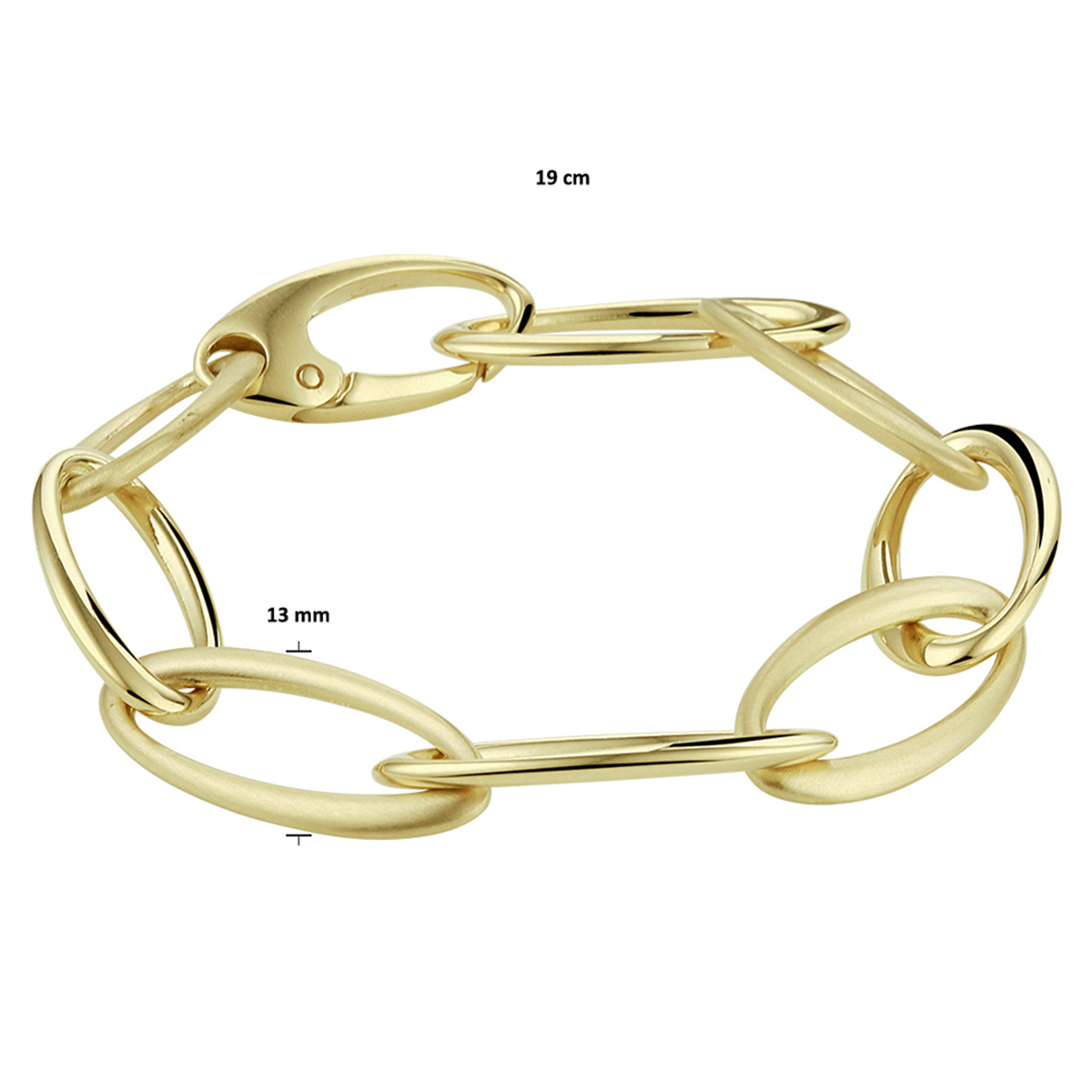 Stijlvolle geelgouden anker armband met een draaglengte van 19cm en een schakelbreedte van 13mm. De armband heeft om en om poli en mat afgewerkte schakels. Uitgevoerd met een stevige karabijn sluiting.