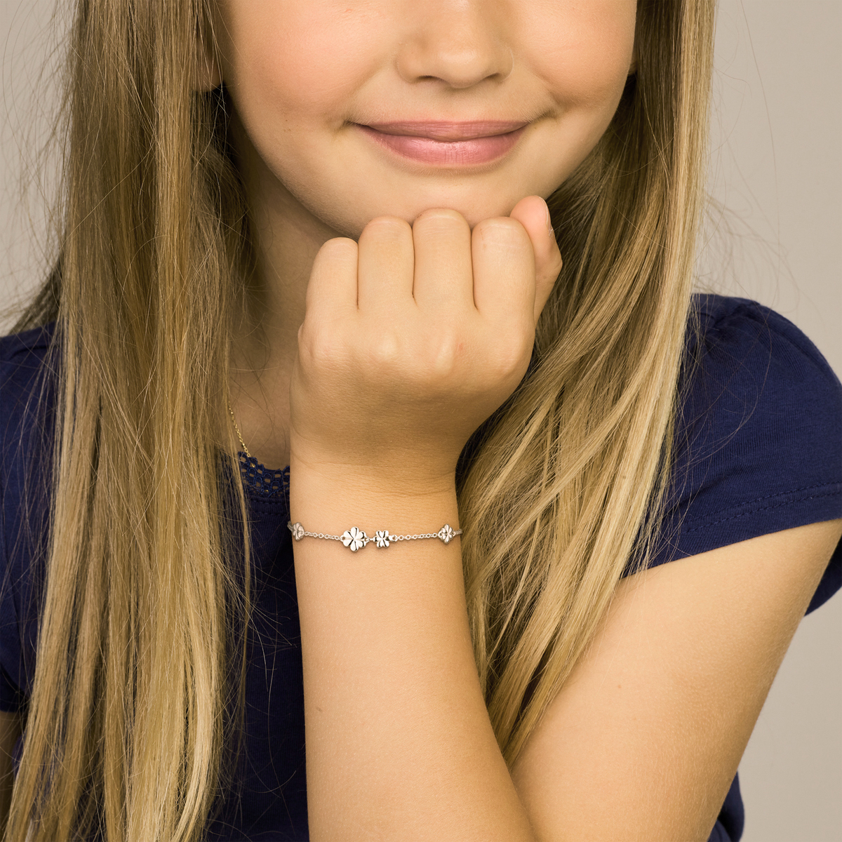 Gerhodineerd 925 zilveren armband uitgevoerd met vier bloemen. De armband heeft een schakelbreedte van 1.5mm en is uitgevoerd met een karabijnsluiting. De draaglengte is 13cm met een extensie van 3cm.