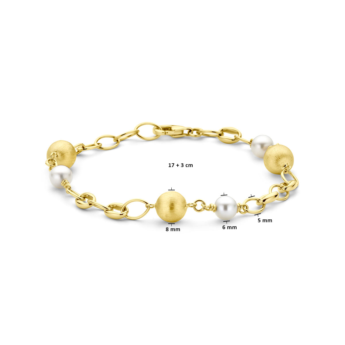 14k Geelgouden armband uitgevoerd met bolletjes en zoetwaterparels. De armband heeft een draaglengte van 17cm met 3cm extensie en schakelbreedte van 5mm. Uitgevoerd met een karabijn sluiting.