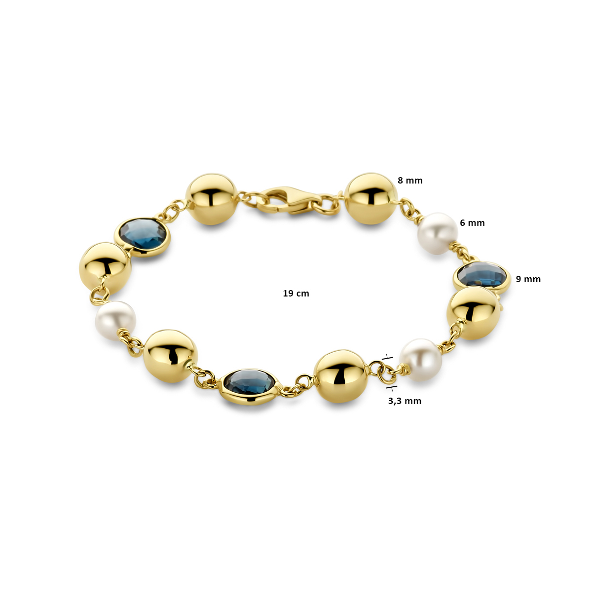 14k Geelgouden armband uitgevoerd met bolletjes, parels en london blue topaas. De armband heeft een draaglengte van 19cm en is uitgevoerd met karabijnsluiting.