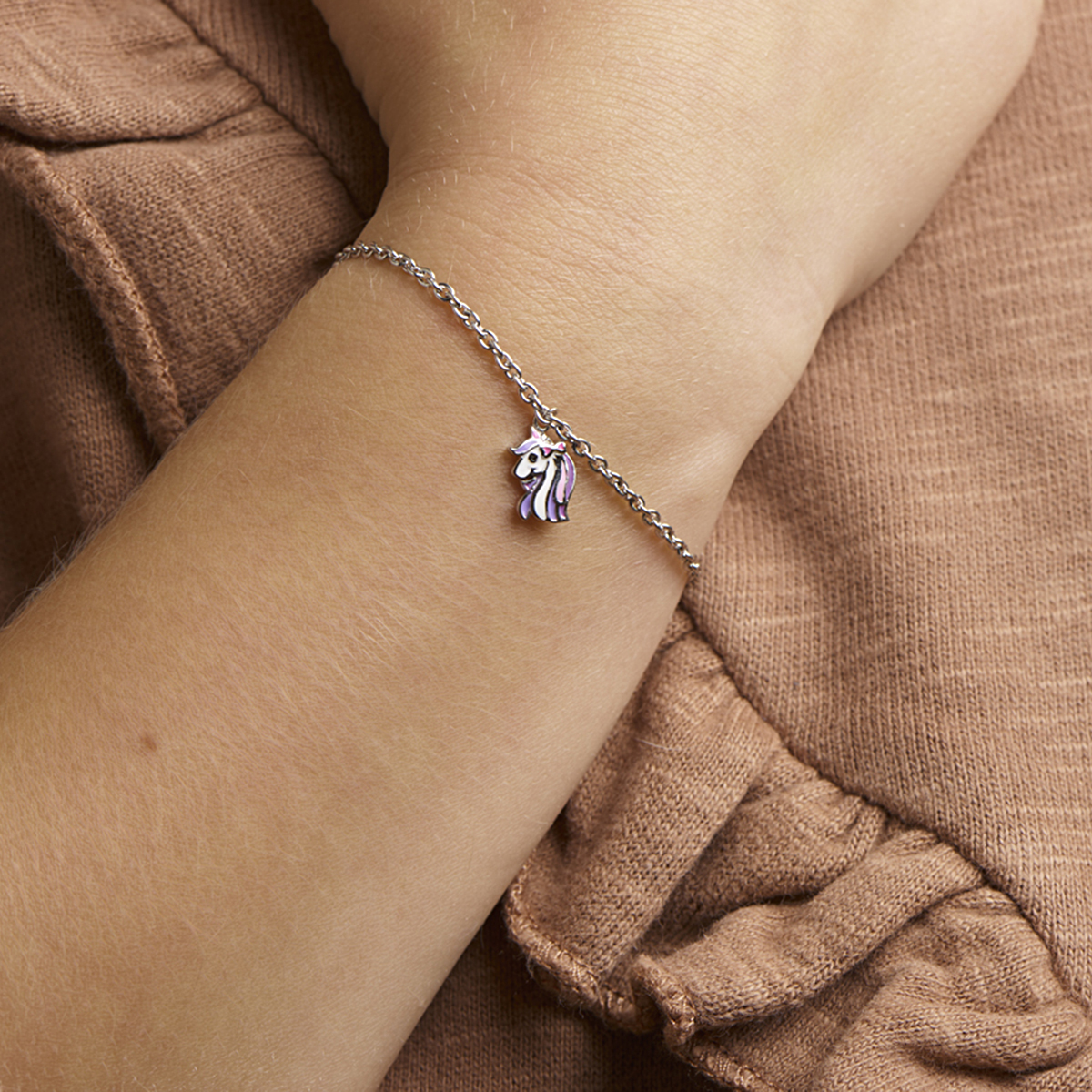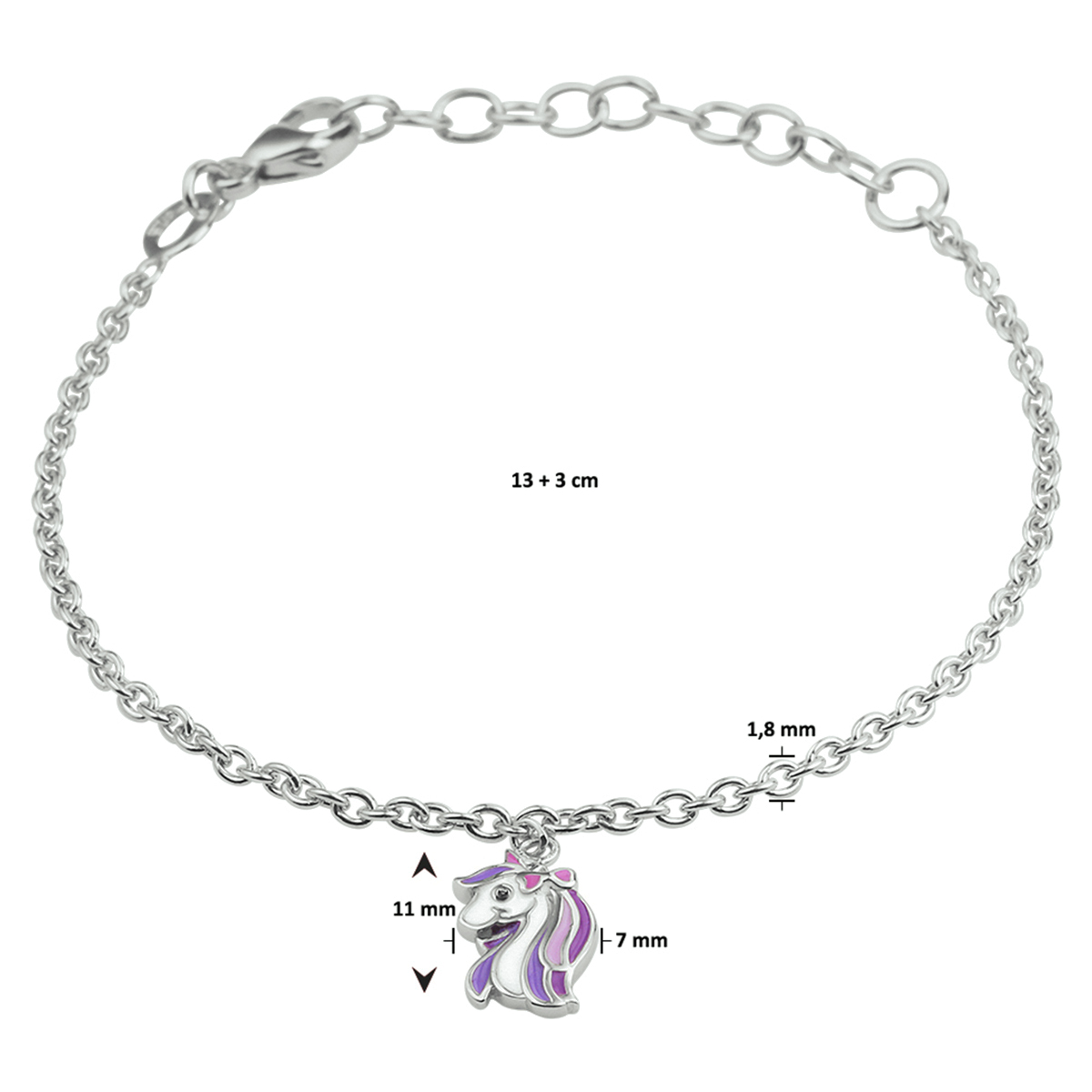 Gerhodineerd 925 zilveren armband uitgevoerd met een leuke emaille eenhoorn hanger en een stevige karabijn sluiting. De armband heeft een draaglengte van 13cm en een extensie van 3cm. De afmeting van de hanger is 11x7mm. De schakelbreedte is 1.8mm.