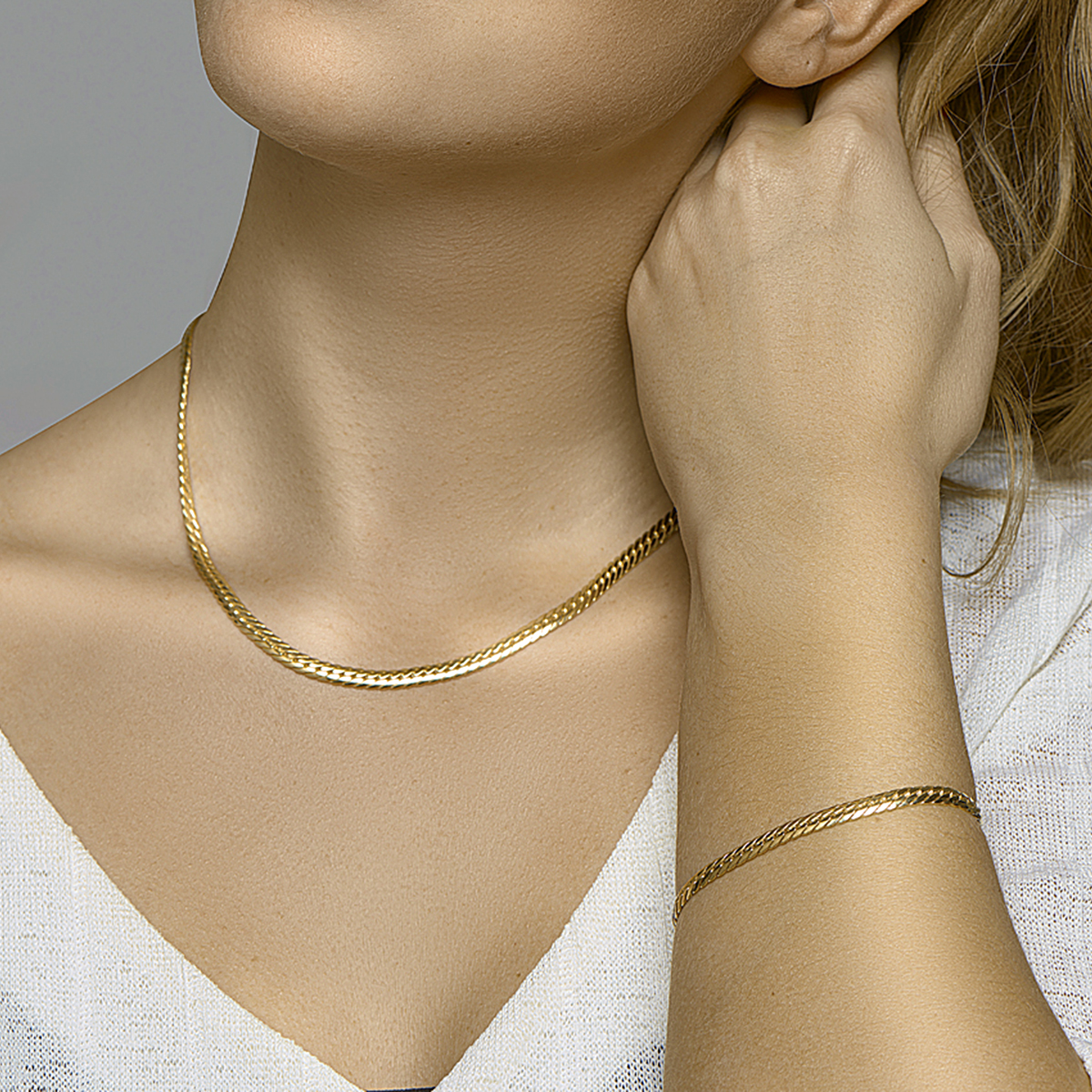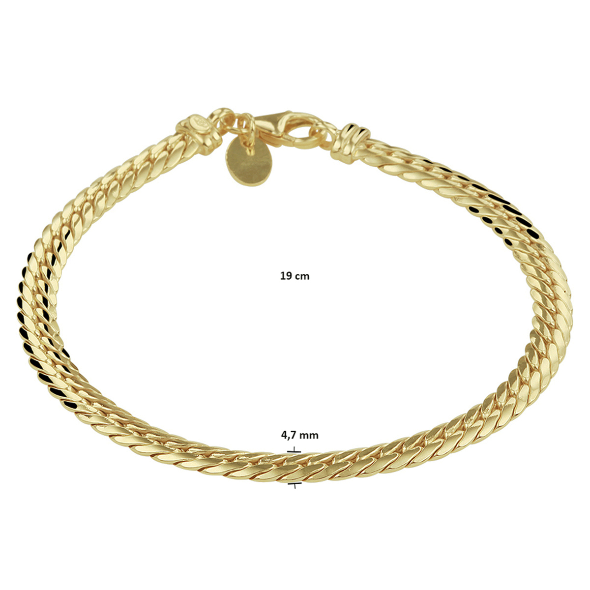 14k Geelgouden gourmet armband met daarin een kern van 925 zilver en uitgevoerd met een stevige karabijn sluiting. De armband heeft een schakelbreedte van 4.7mm en een draaglengte van 19cm.