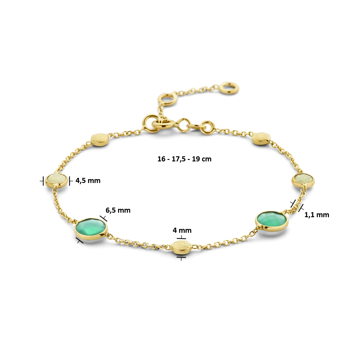 14k Geelgouden armband uitgevoerd met groen agaat en groen kwartsiet stenen. De armband heeft draaglengtes van 16, 17.5 en 19cm. De schakelbreedte is 1.1mm.