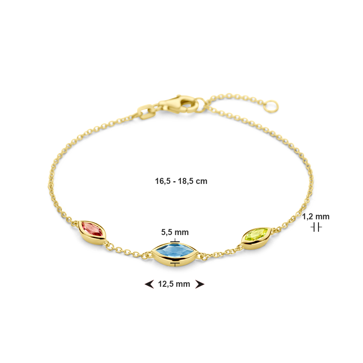 14k Geelgouden armband uitgevoerd met peridot, roze rhodoliet en London blue topaas. De armband heeft draaglengtes van 16.5-18.5cm. De schakelbreedte is 1.2mm.