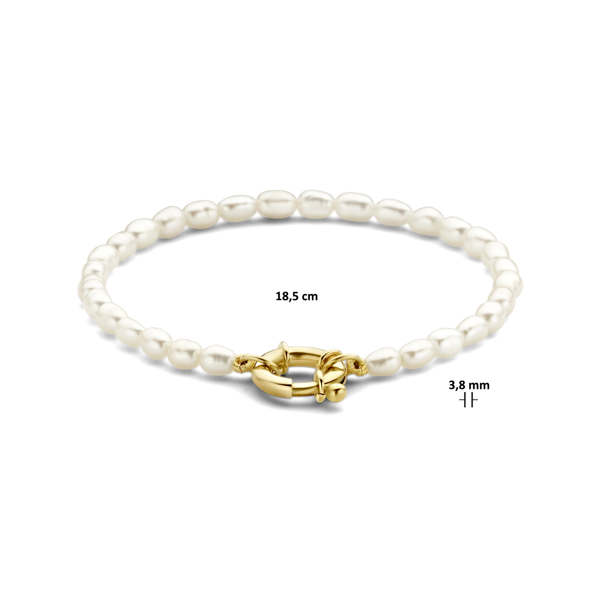 14k Geelgouden armband uitgevoerd met zoetwaterparels en een groot veerslot. De armband heeft een draaglengte van 18.5cm.