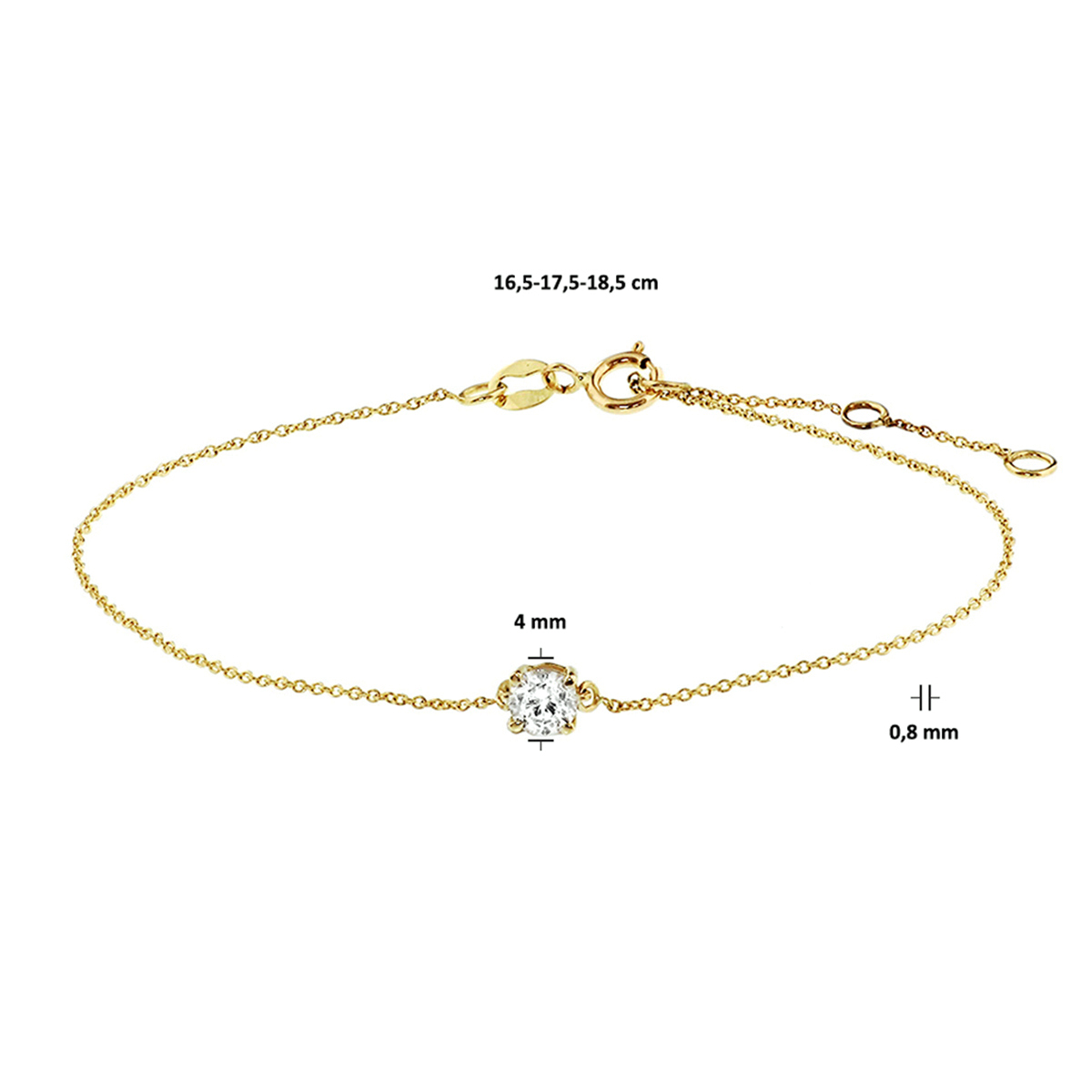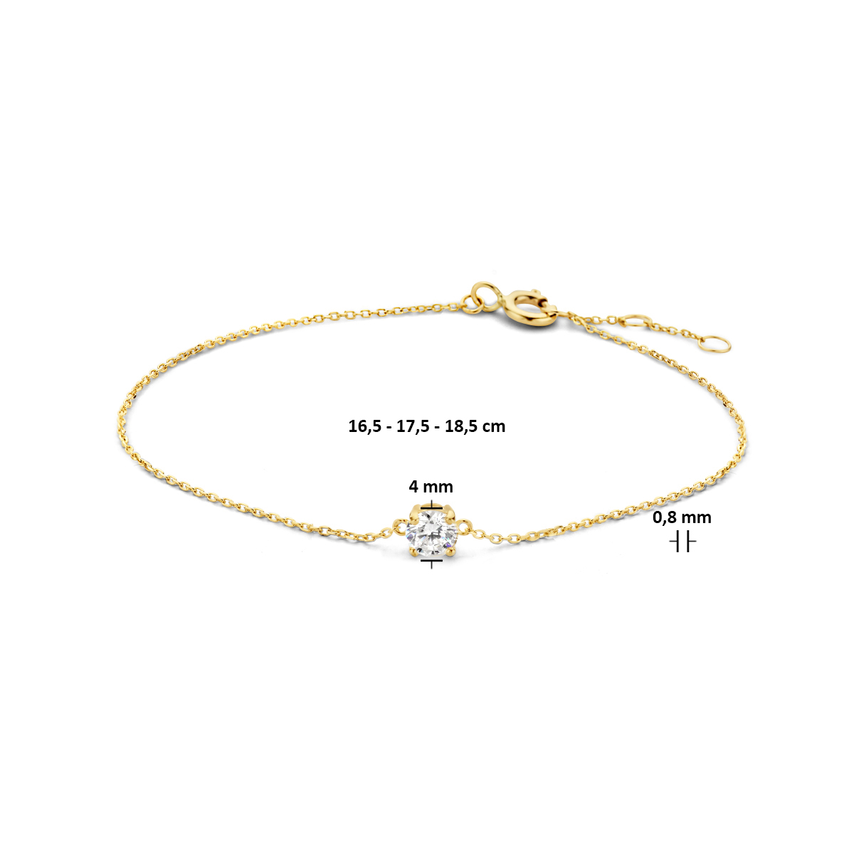 14k Geelgouden anker armband uitgevoerd met een schitterende zirkonia. Deze armband met draaglengtes van 16.5, 17.5 en 18.5cm past bij iedere outfit en is met veel andere sieraden te combineren. De steen heeft een diameter van 4mm. De schakelbreedte is 0.8mm.