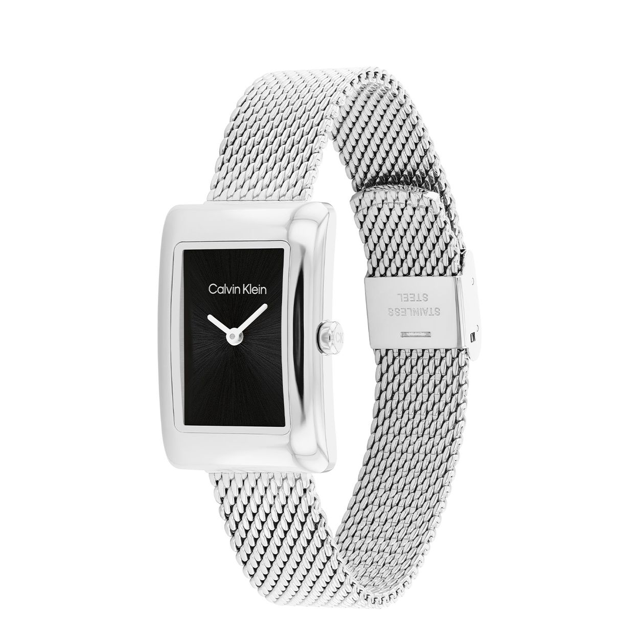 Dit Calvin Klein dameshorloge met nr CK25200399 is een chique ontwerp. De zilverkleurige rechthoekige stalen kast heeft een fijne bolling in de rand, dit geeft het klokje een stijlvol uiterlijk. Op de zwarte sunray wijzerplaat zijn de fijne wijzers mooi zichtbaar en staat de naam Calvin Klein afgedrukt. Aan de gladde kast zit een zilverkleurige milanese band. Het sierlijke horloge heeft een mineraalglas, een doorsnee van 22,5mm en is 3 ATM.
