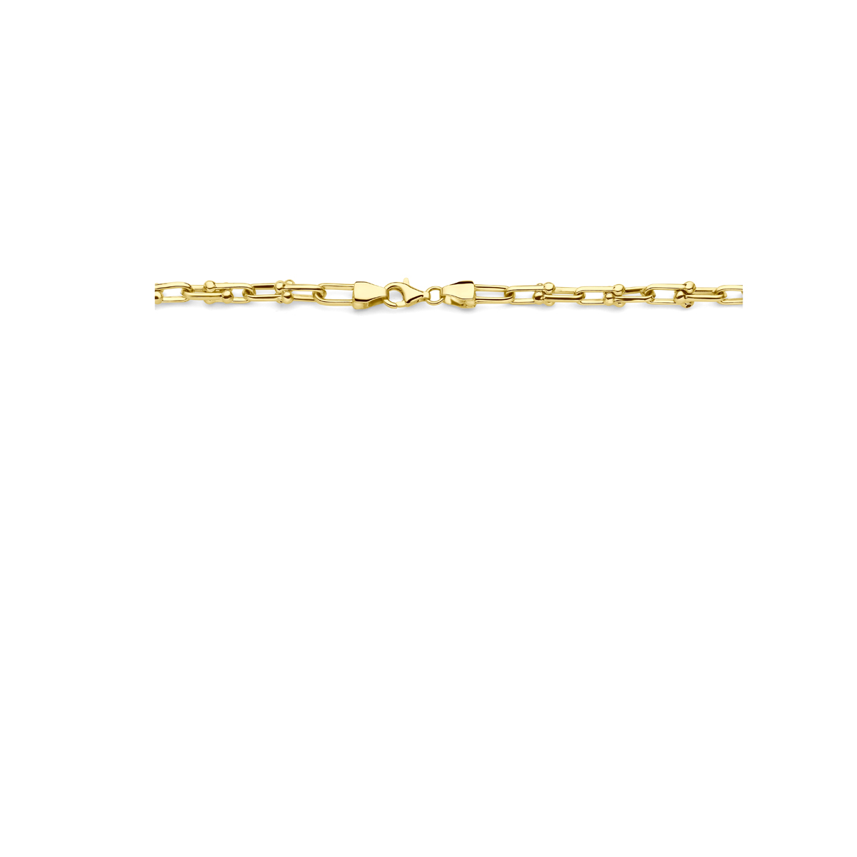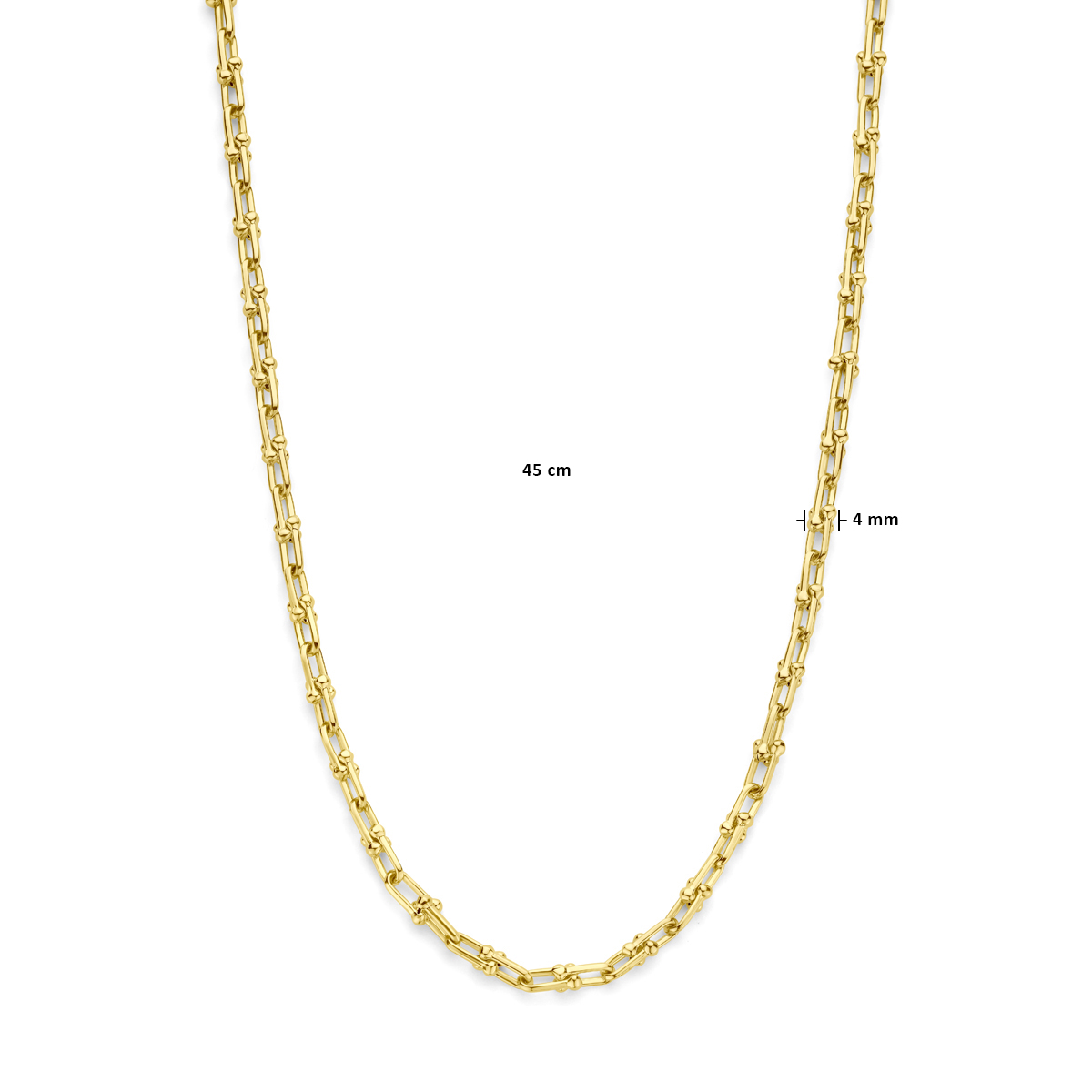 14k Geelgouden collier met een fantasie schakel van 4mm. Het collier heeft een draaglengte van 45 en is uitgevoerd met karabijnsluiting.