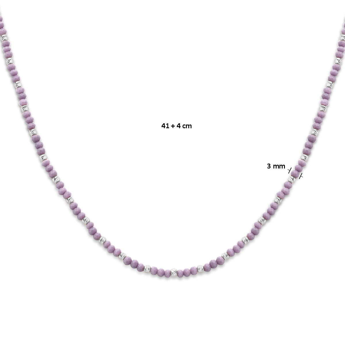 Gerhodineerd 925 zilveren collier uitgevoerd met violet glas en een karabijn sluiting. Het collier heeft een draaglengte van 41cm en een extensie van 4cm.