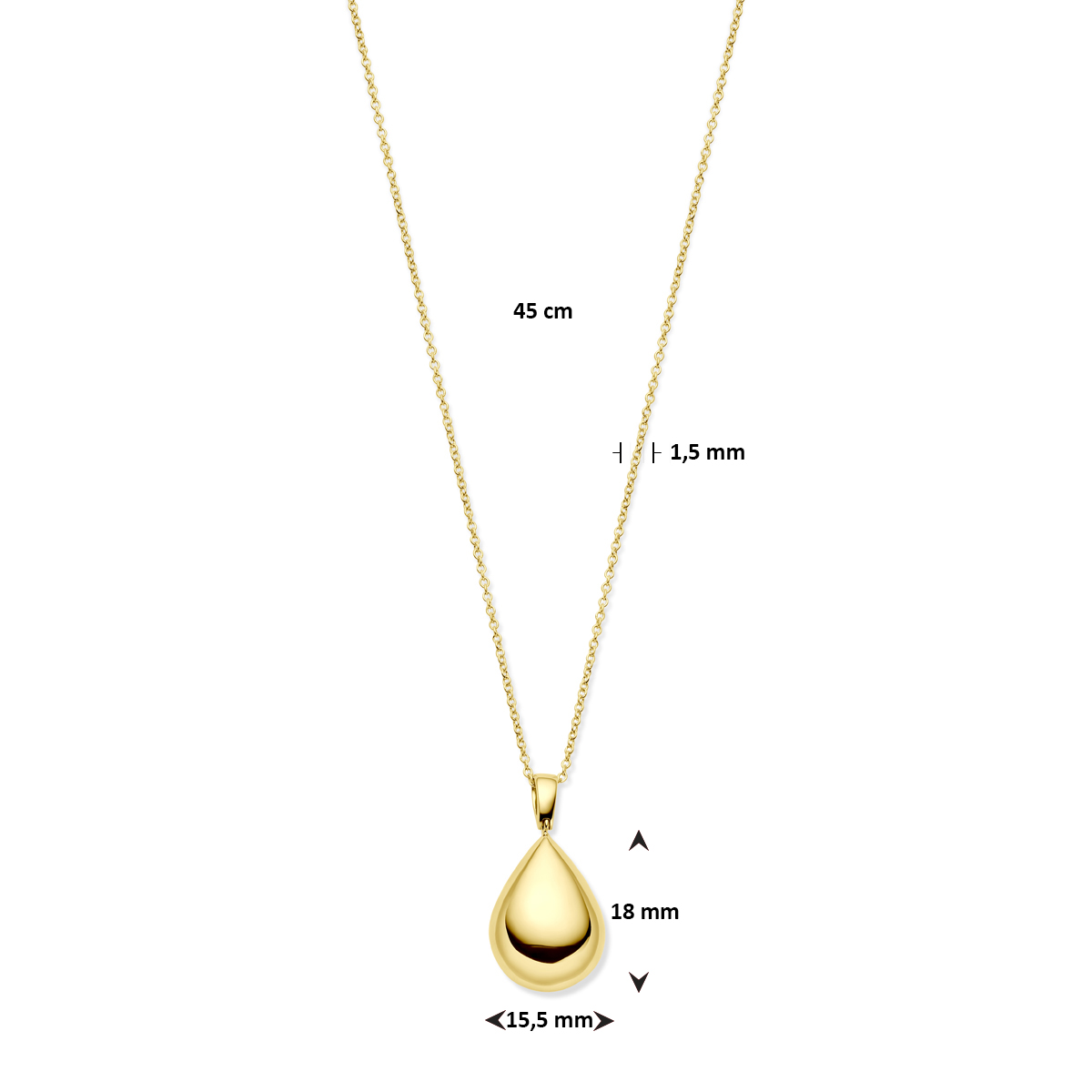 14k Geelgouden collier uitgevoerd met een druppel. Het collier heeft een draaglengte van 45cm en een schakelbreedte van 1.2mm. Uitgevoerd met karabijnsluiting.