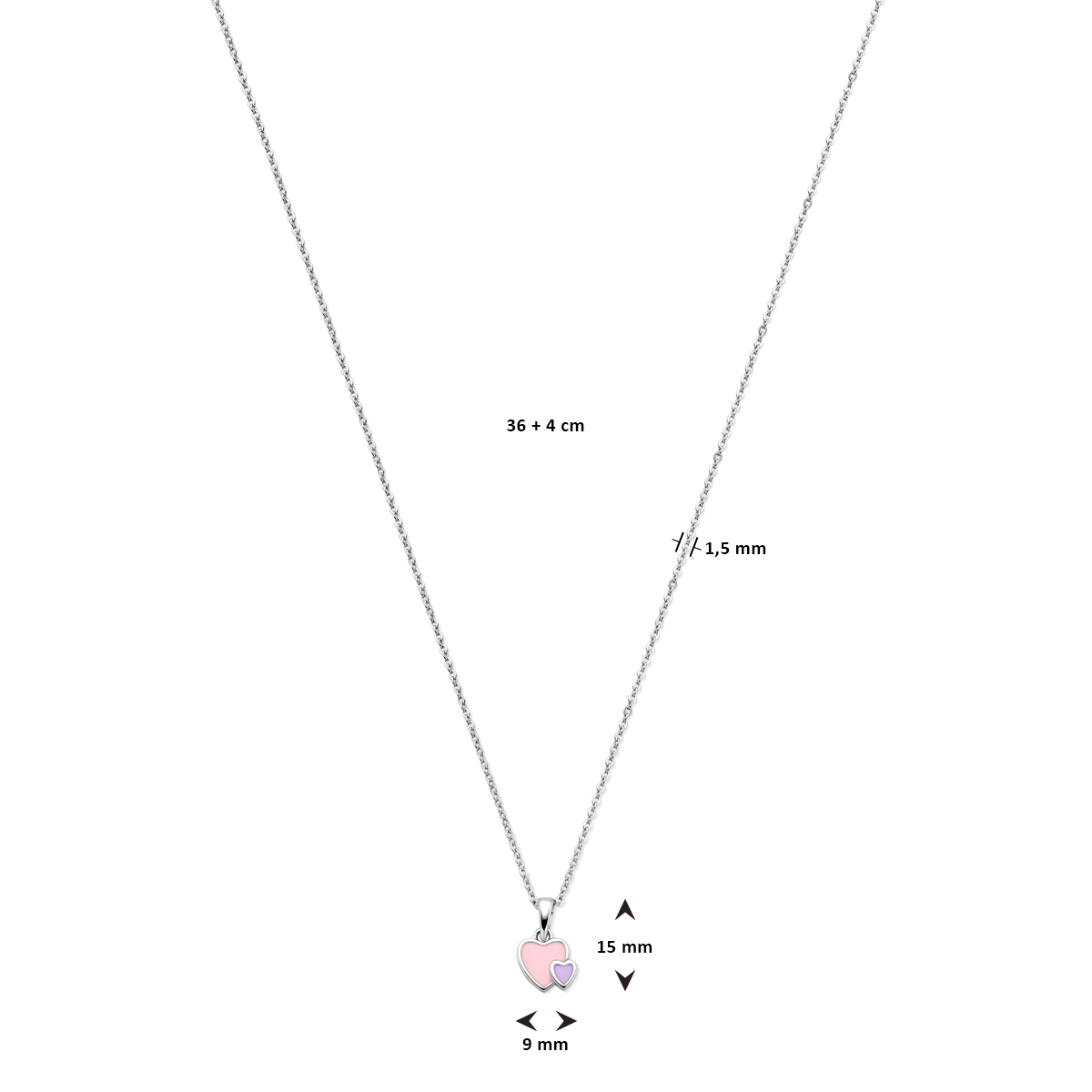 Gerhodineerd 925 zilveren collier met twee harten, met roze en paars emaille. Het collier heeft een draaglengte van 36cm met 4cm extensie. Uitgevoerd met een karabijn sluiting. Het collier heeft een schakelbreedte van 1.5mm.