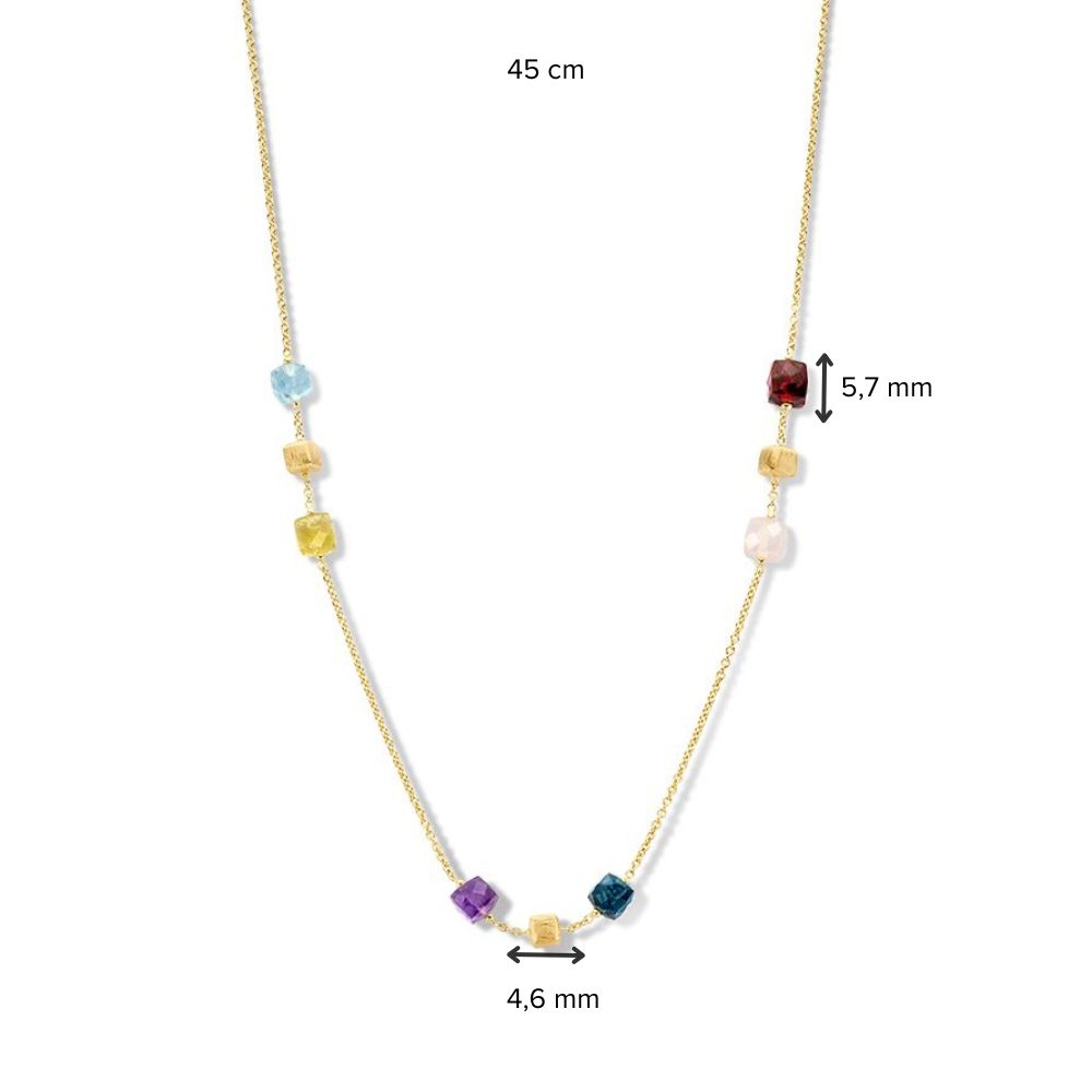 Geelgouden collier met matgouden elementen en vierkant geslepen edelstenen (topaas,�peridot, amethist, london blue topaas, roze quartz en granaat).