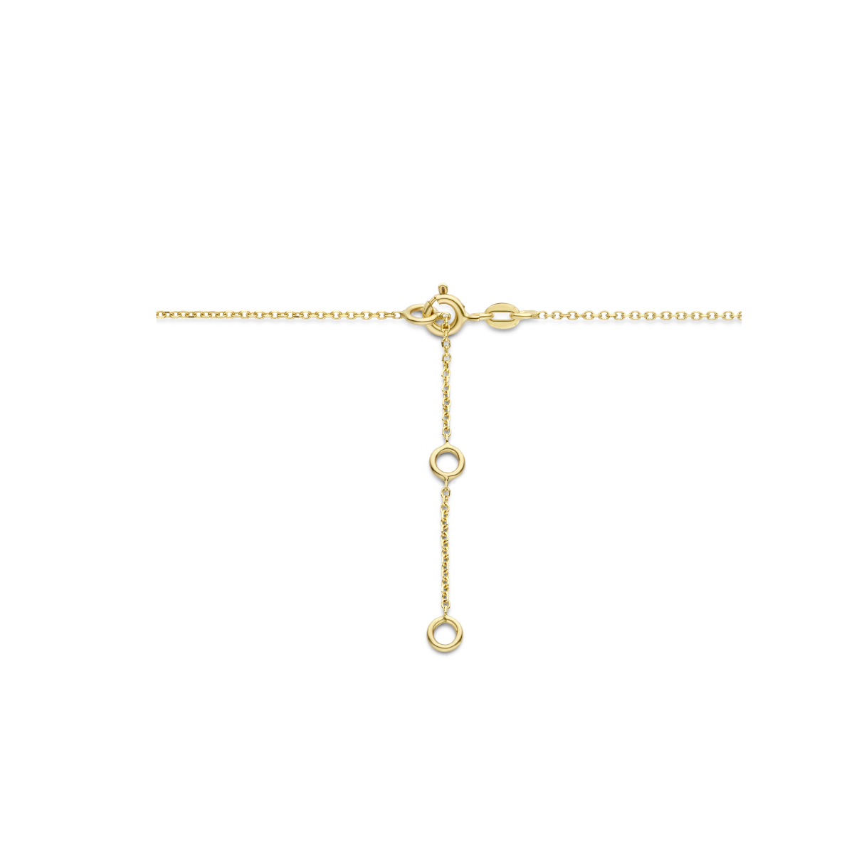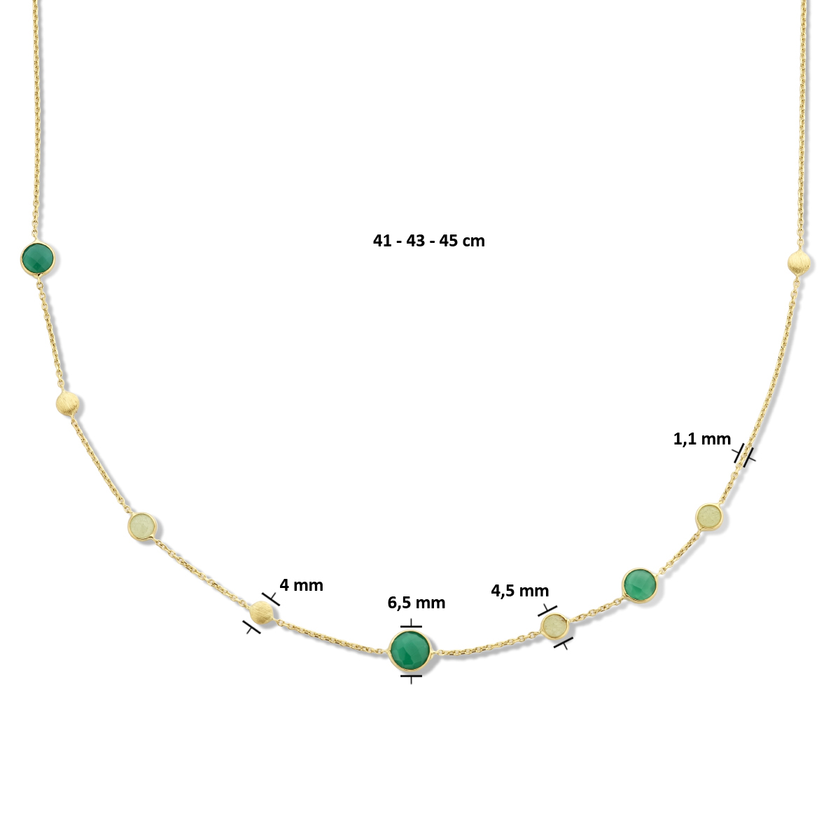 14k Geelgouden collier uitgevoerd met groen agaat en groen kwartsiet stenen. Het collier heeft  draaglengtes van 41, 43 en 45cm. De schakelbreedte is 1.1mm.