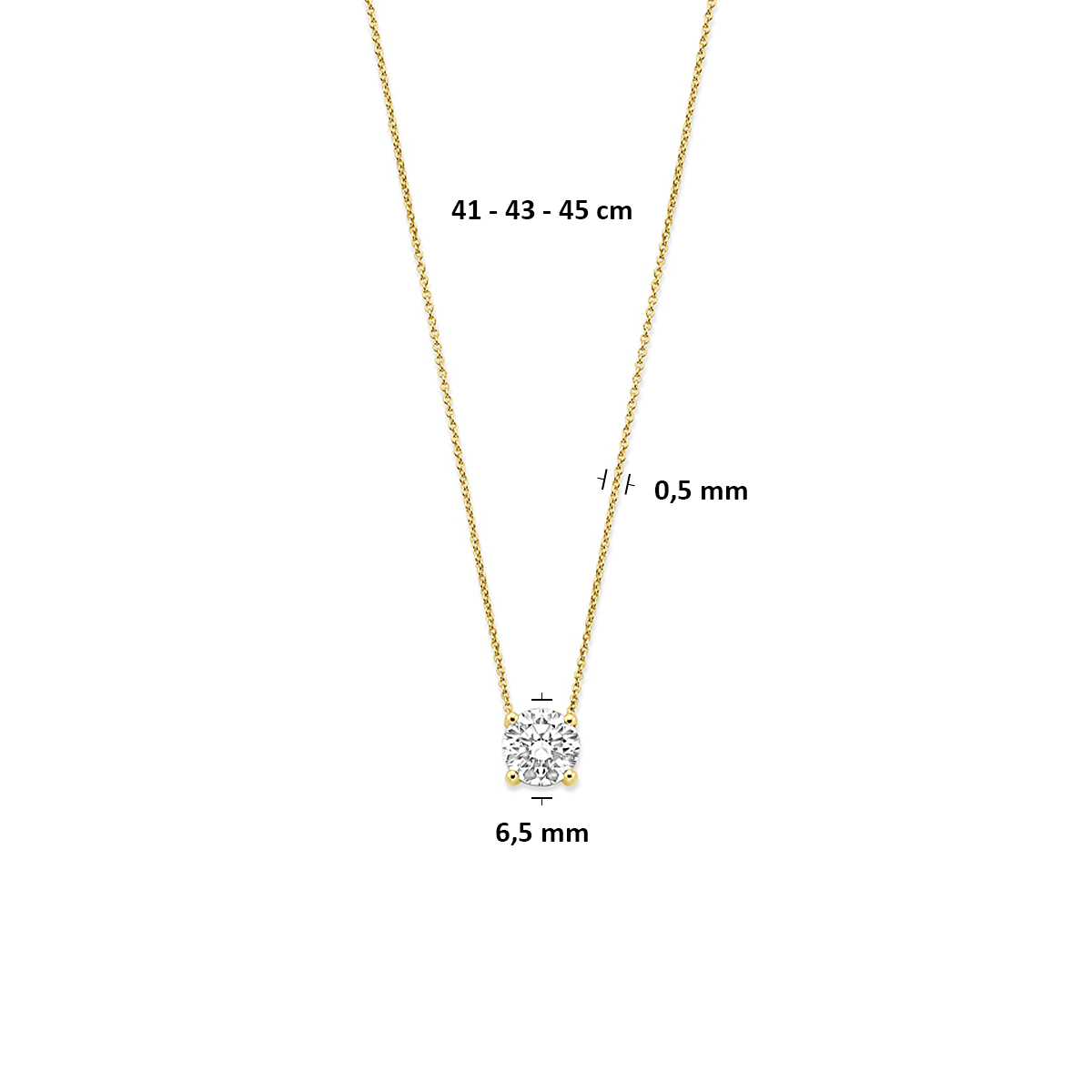 14k Geelgouden collier uitgevoerd met lab grown diamant. Het collier heeft draaglengtes van 41-43-45cm. Het totale diamantgewicht is 1.00ct. Dit artikel wordt geleverd met certificaat van de diamant.