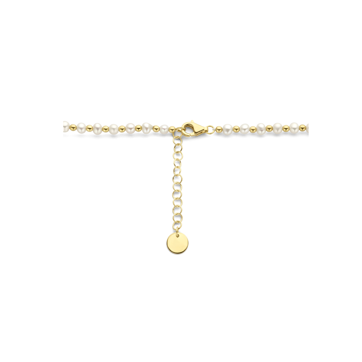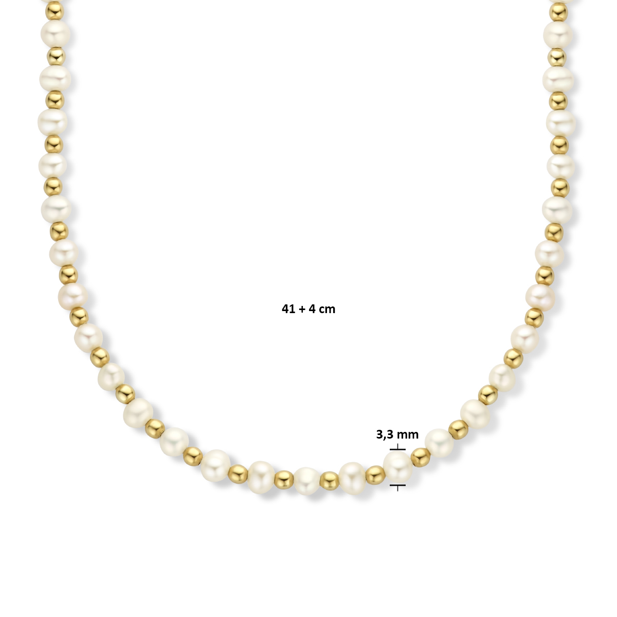 14k Geelgouden collier uitgevoerd met schitterende zoetwaterparels, bolletjes en een karabijnsluiting. Het collier heeft een draaglengte van 41cm en een extensie van 4cm.