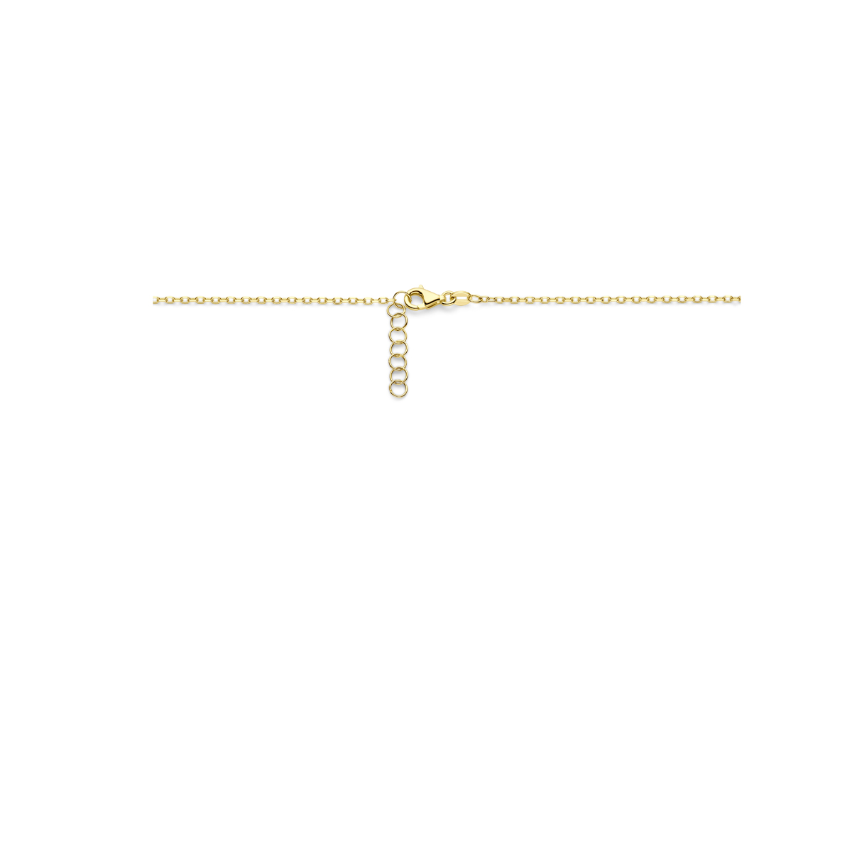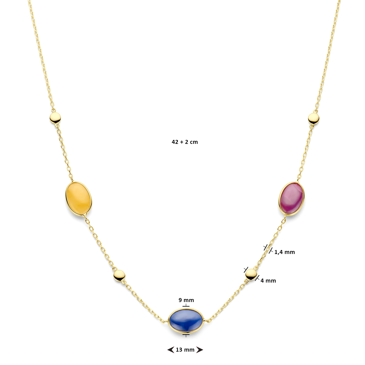 14k Geelgouden collier uitgevoerd met geel, rood en blauwe saffier. Het collier heeft een draaglengte van 42cm met 2cm extensie. De schakelbreedte is 1.4mm. Uitgevoerd met karabijnsluiting.