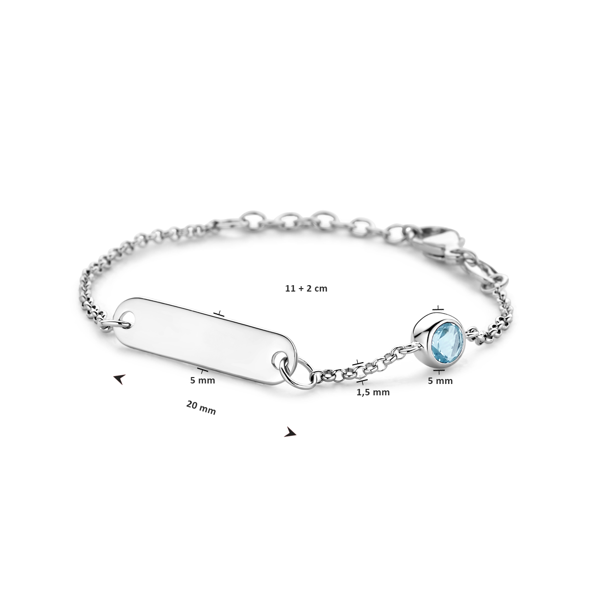 Gerhodineerd 925 zilveren graveerarmband uitgevoerd met een geboortesteen. De armband heeft een draaglengte van 11cm met 2cm extensie. De schakelbreedte is 1.5mm. De graveerplaat heeft een afmeting van 5x20mm en een dikte van 0.6mm.