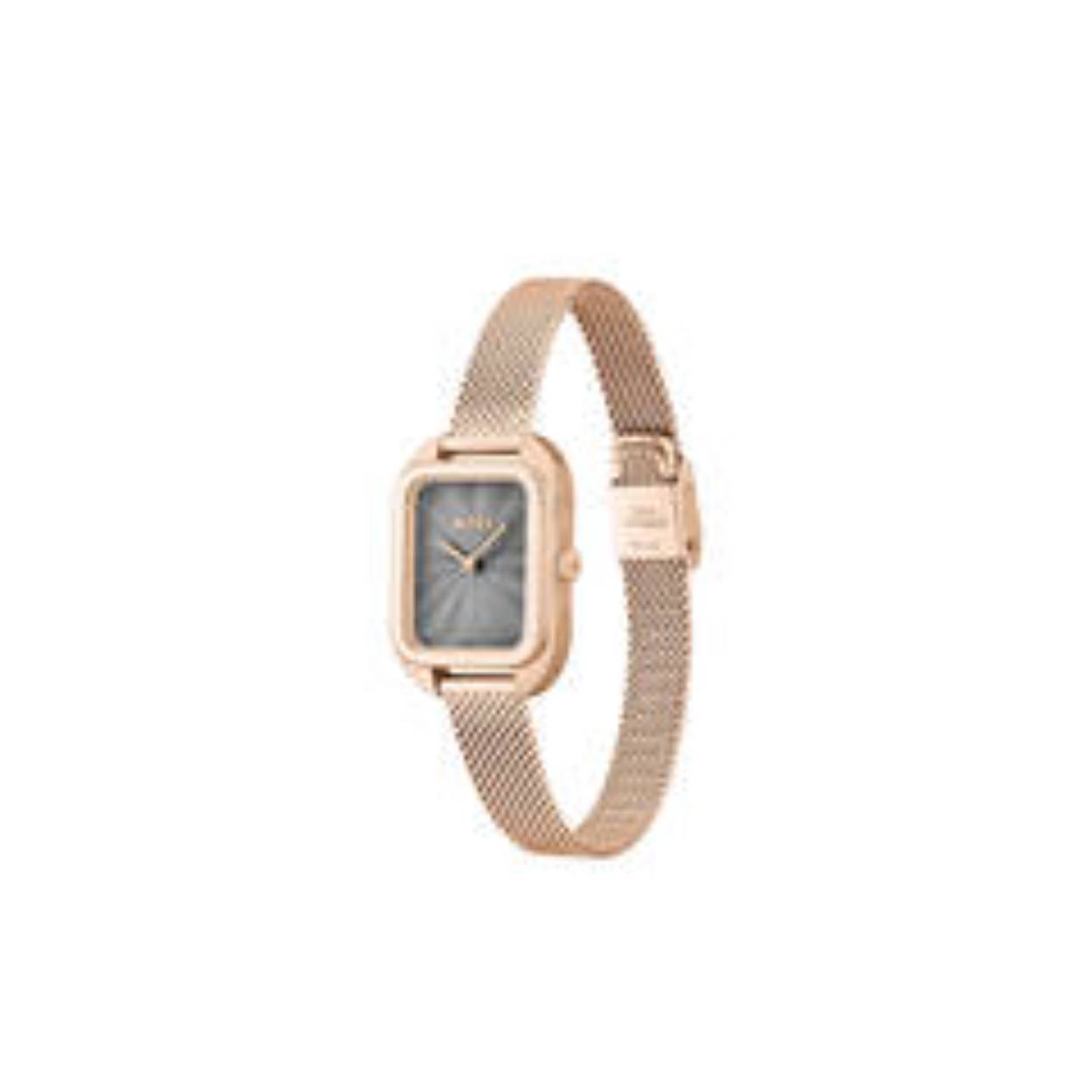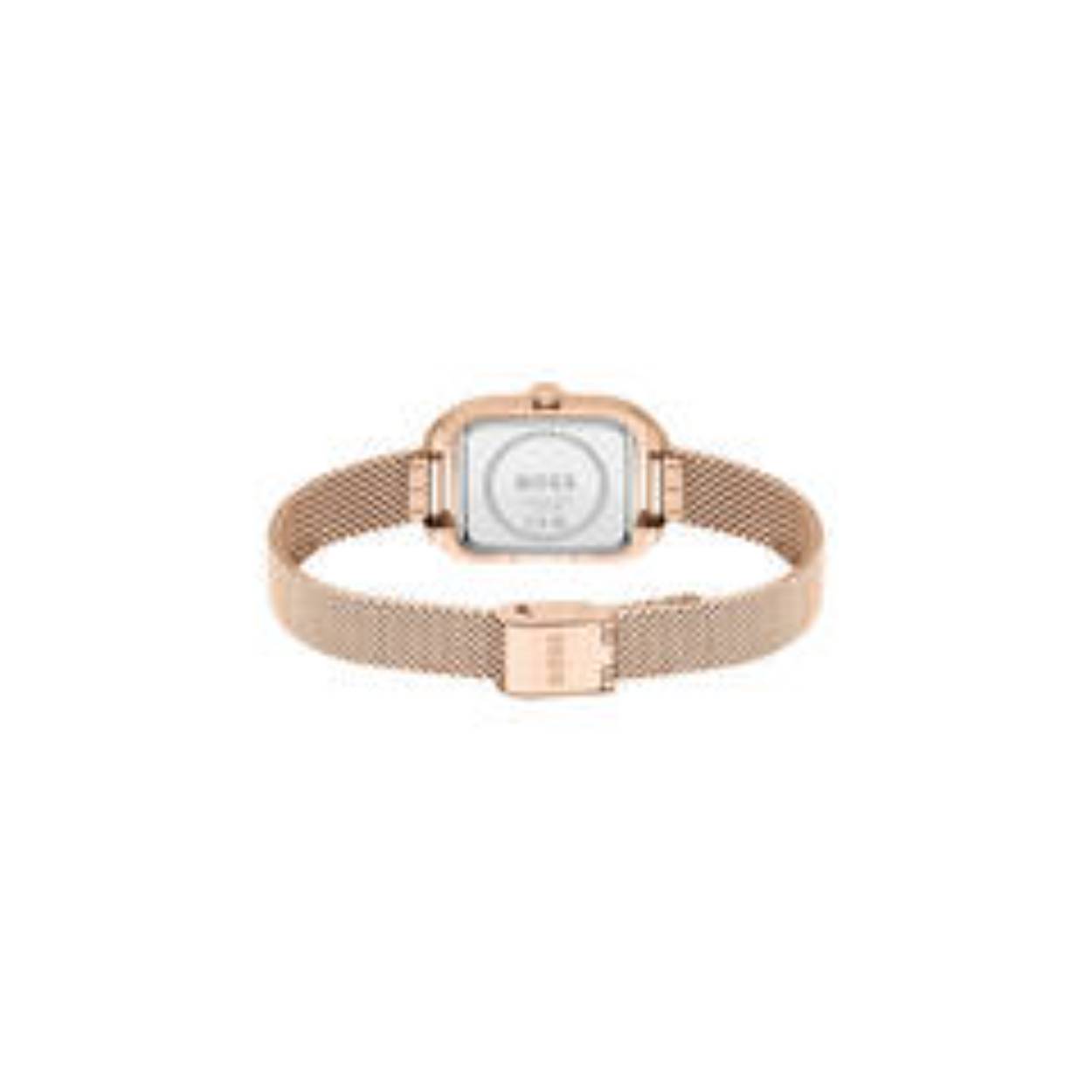 Hugo Boss dames horloge met een rosékleurige mesch band en een zacht grijze wijzerplaat.