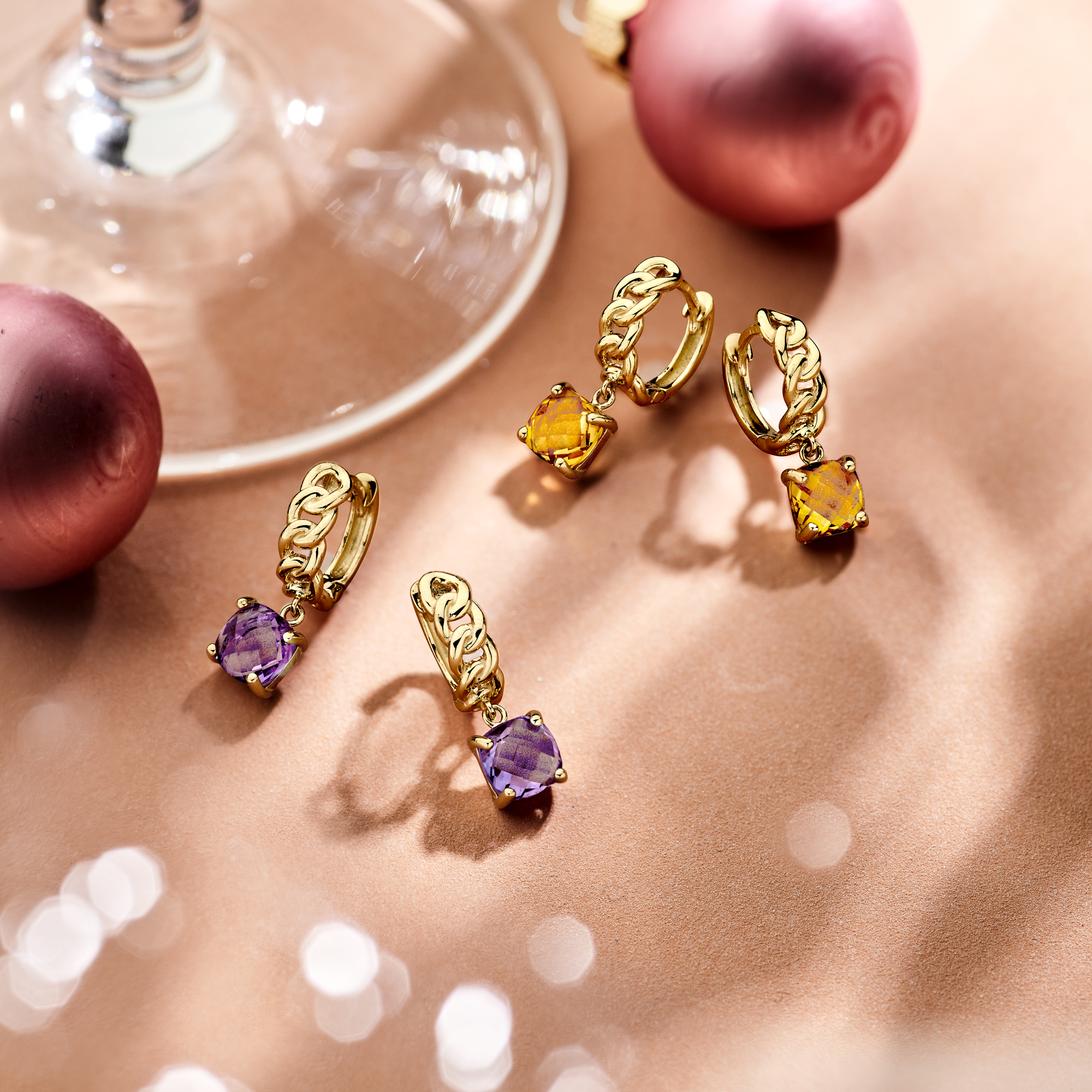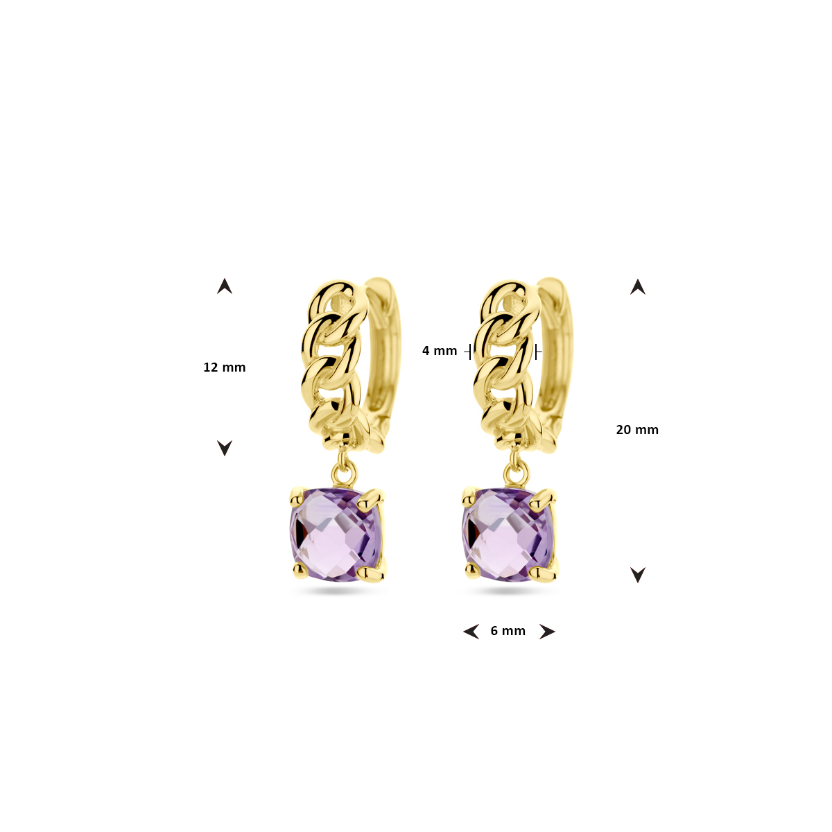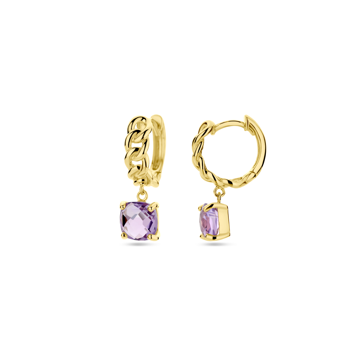 14k Geelgouden klapoorringen met schakelmotief, uitgevoerd met een amthist hanger. De klapoorring heeft een diameter van 12mm en een breedte van 4mm.