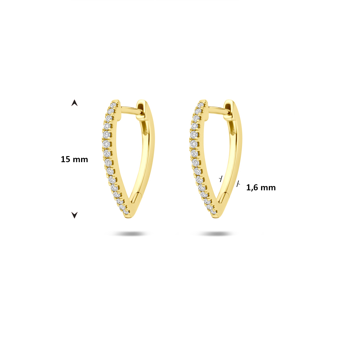 14k Geelgouden klapoorringen uitgevoerd met lab grown diamant. De klapoorringen hebben een afmeting van 15x12 mm. Het totale diamantgewicht is 0.12ct (2x0.06ct). Lab grown diamanten zijn diamanten die ontstaan in een laboratorium. Onder extreem hoge druk en temperatuur wordt het natuurlijk ontstaansproces nagebootst met als eindresultaat een diamant met dezelfde chemische eigenschappen maar met een andere oorsprong.