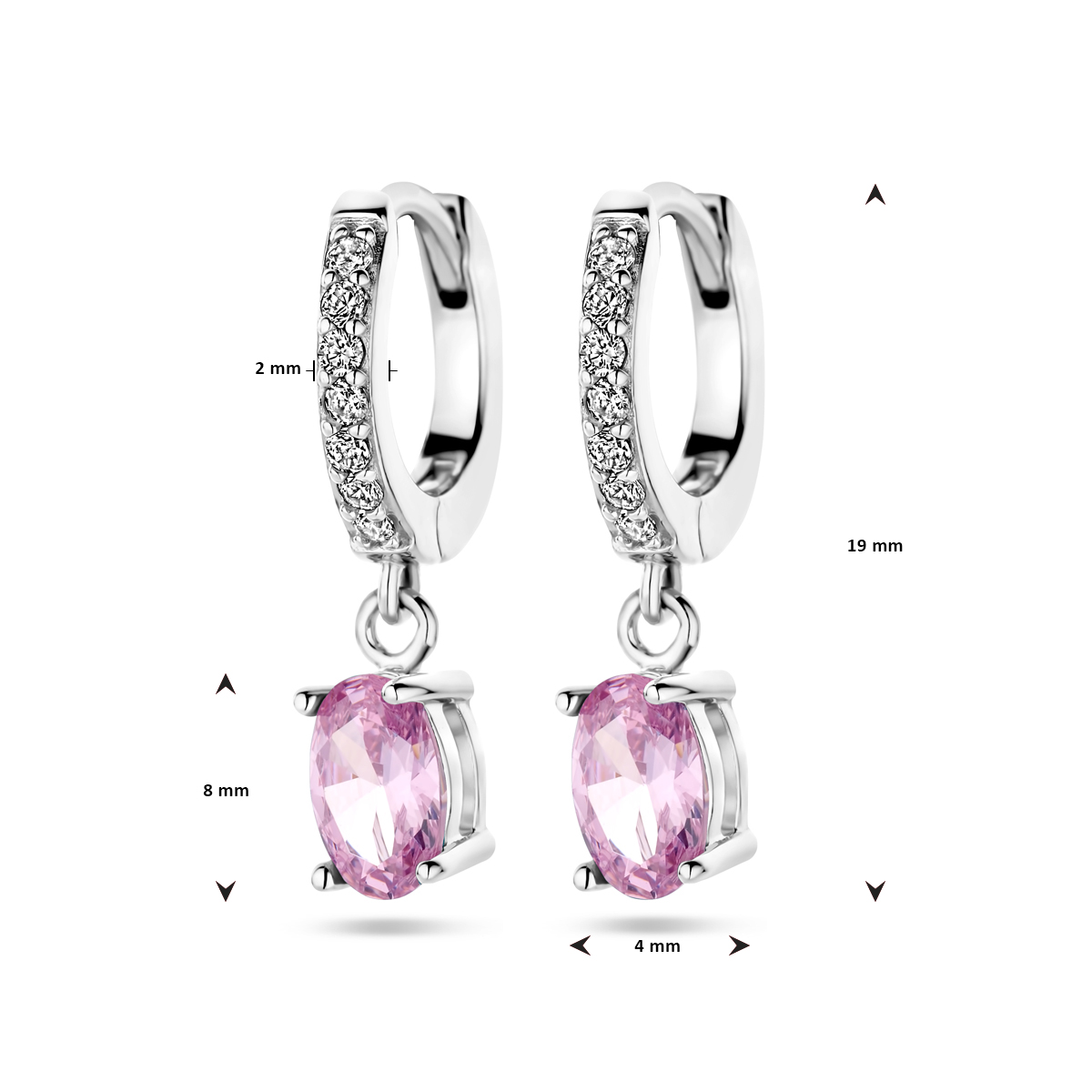 Gerhodineerd 925 zilveren klapoorringen uitgevoerd met witte en roze zirkonia. De totale hoogte is 19mm.