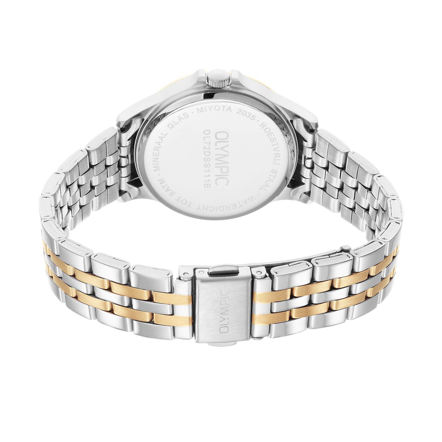 Dit unieke Olympic horloge met artikelnummer: OL72DSS111B is een dameshorloge met een classic sportieve uitstraling. Het horloge heeft een ronde stalen kast met een goudkleurige bezel en een witte wijzerplaat met de 12, streepjes en lumibrite accenten. Aan de kast zit een stalen bicolor schakelband met vouwsluiting. Het horloge heeft een mineraalglas, een doorsnee van 32mm en is 5ATM.
