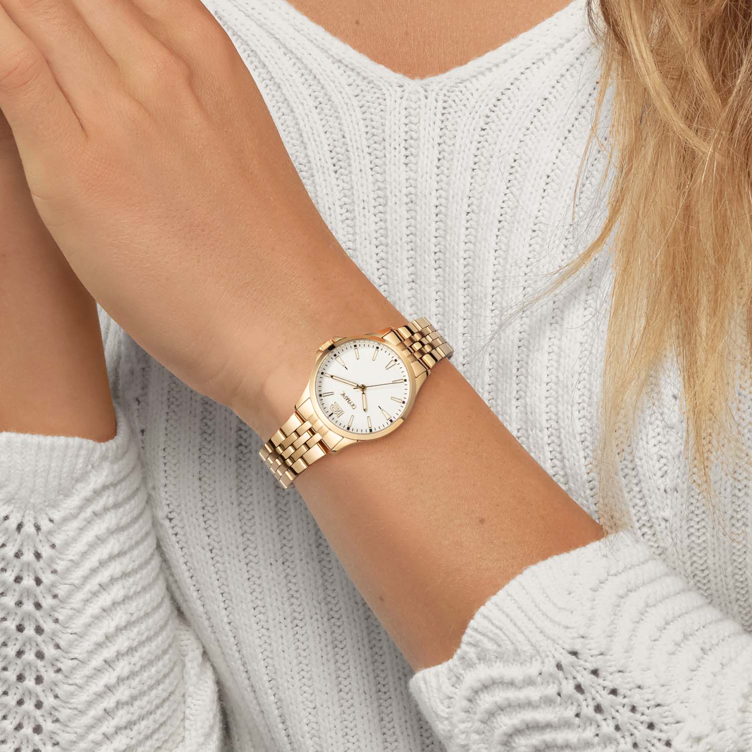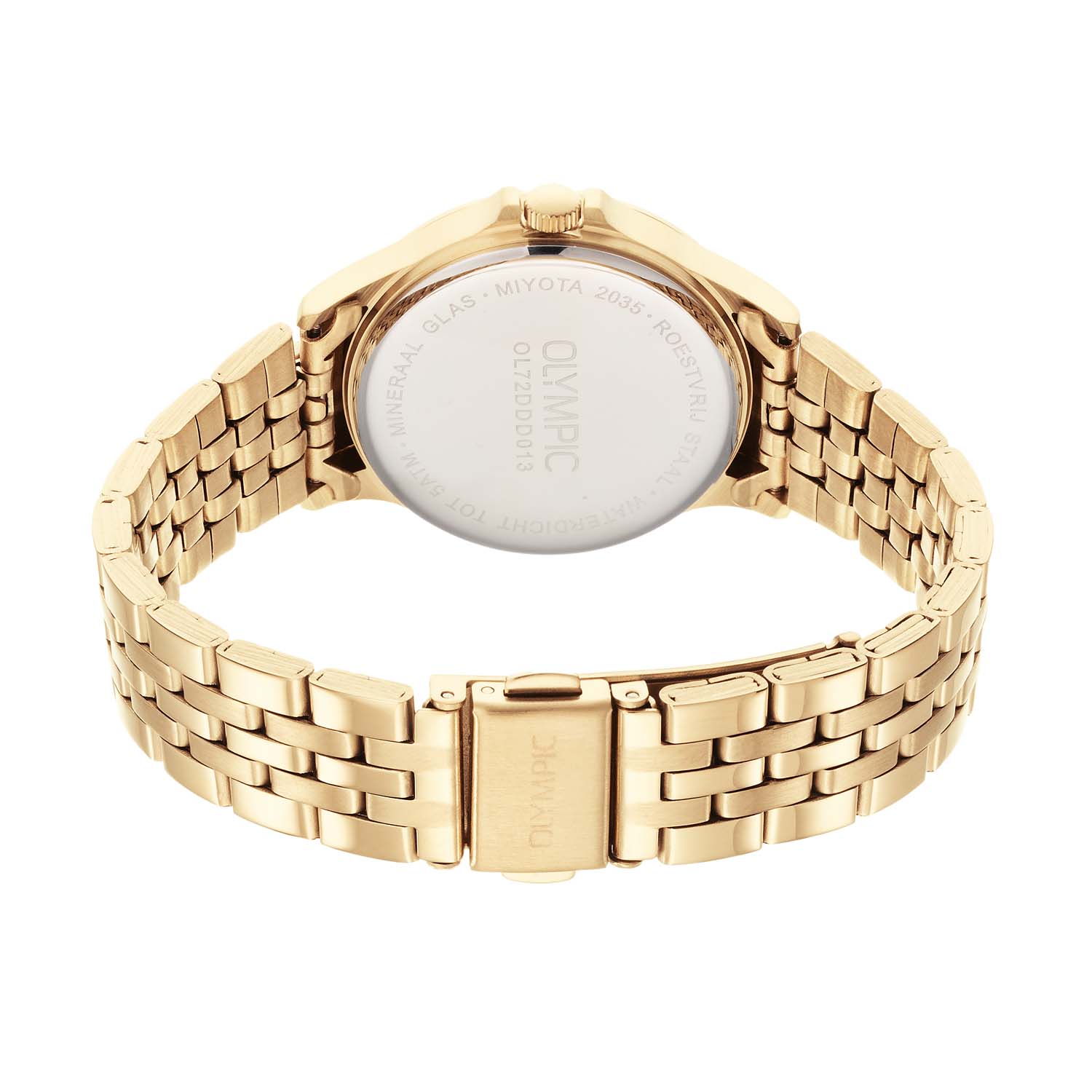Dit unieke Olympic horloge met artikelnummer: OL72DDD013 is een dameshorloge met een classic sportieve uitstraling. Het horloge heeft een ronde goudkleurige stalen kast met een witte wijzerplaat met de 12, streepjes en lumibrite accenten. Aan de kast zit een goudkleurige stalen schakelband met vouwsluiting. Het horloge heeft een mineraalglas, een doorsnee van 32mm en is 5ATM.