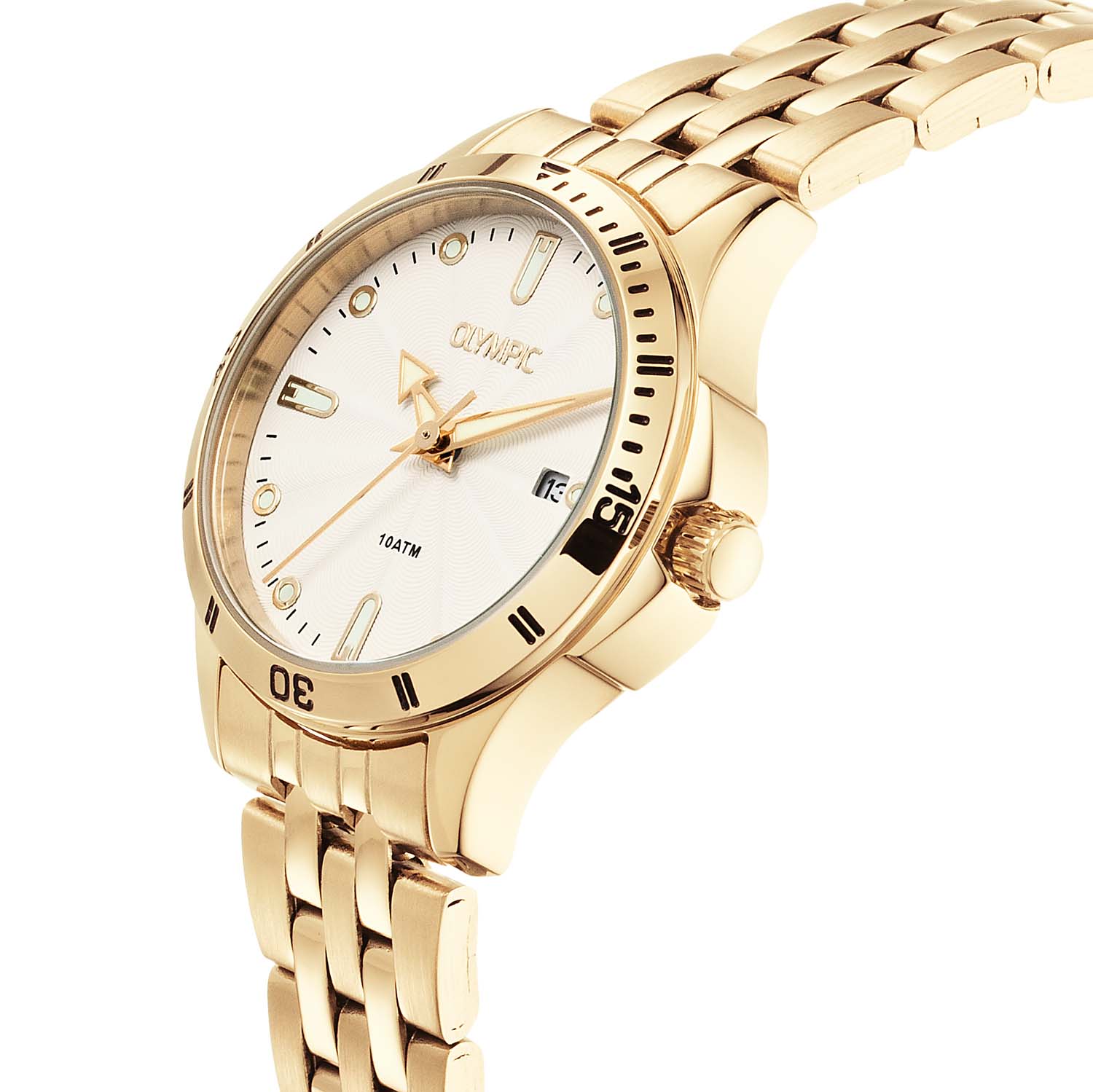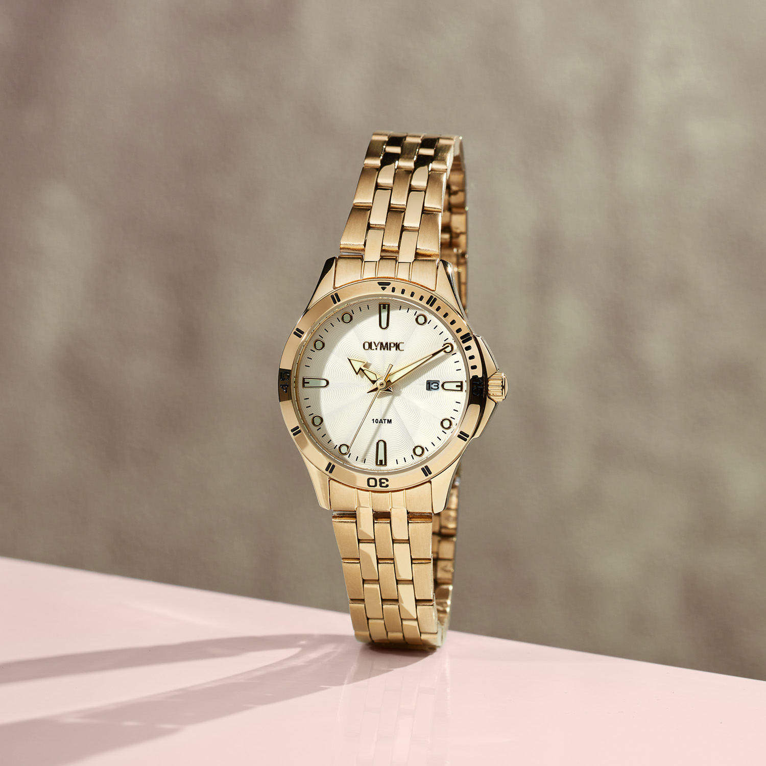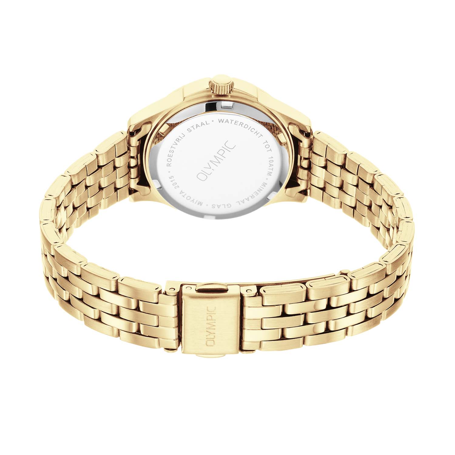 Dit unieke Olympic horloge met artikelnummer: OL72DDD014 is een dameshorloge met een classic sportieve uitstraling. Het horloge heeft een ronde goudkleurige stalen kast met een champagnekleurige wijzerplaat met een datum, witte strepen en stippen ingelegd met lumibrite. Aan de kast zit een goudkleurige stalen schakelband met vouwsluiting. Het horloge heeft een mineraalglas, een doorsnee van 28mm en is 10ATM.
