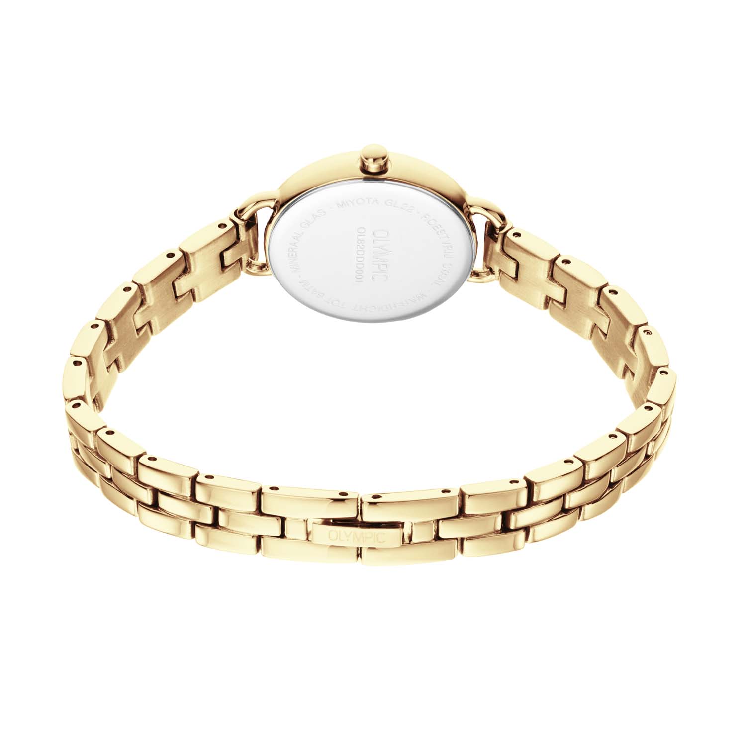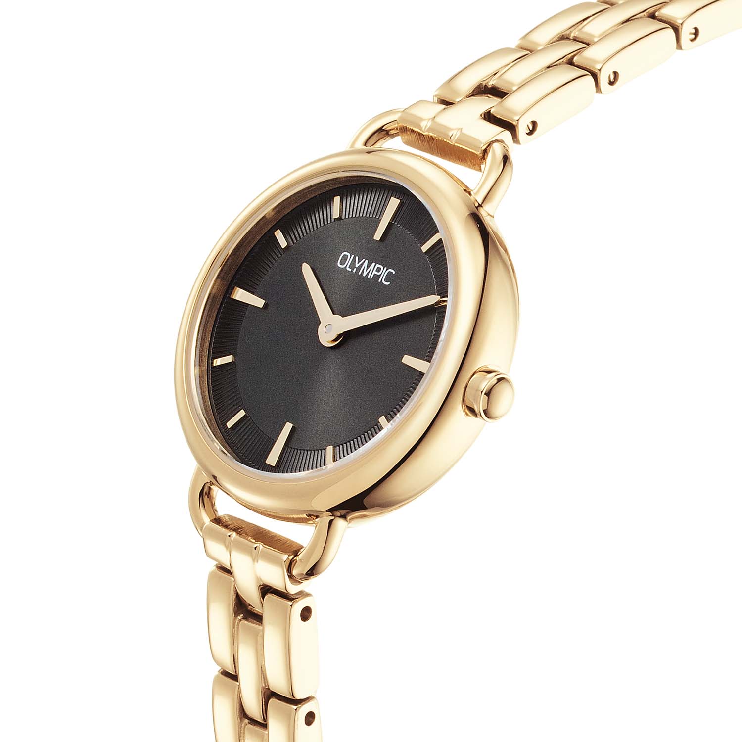 Dit unieke Olympic horloge met artikelnummer: OL82DDD001 is een dameshorloge met een chique uitstraling. Het horloge heeft een ronde goudkleurige stalen kast met een donker grijze sunray wijzerplaat met fijne streepjes. Aan de kast zit een stalen fijne goudkleurige schakelband met druksluiting. Het horloge heeft een mineraalglas, een doorsnee van 26mm en is 3ATM.