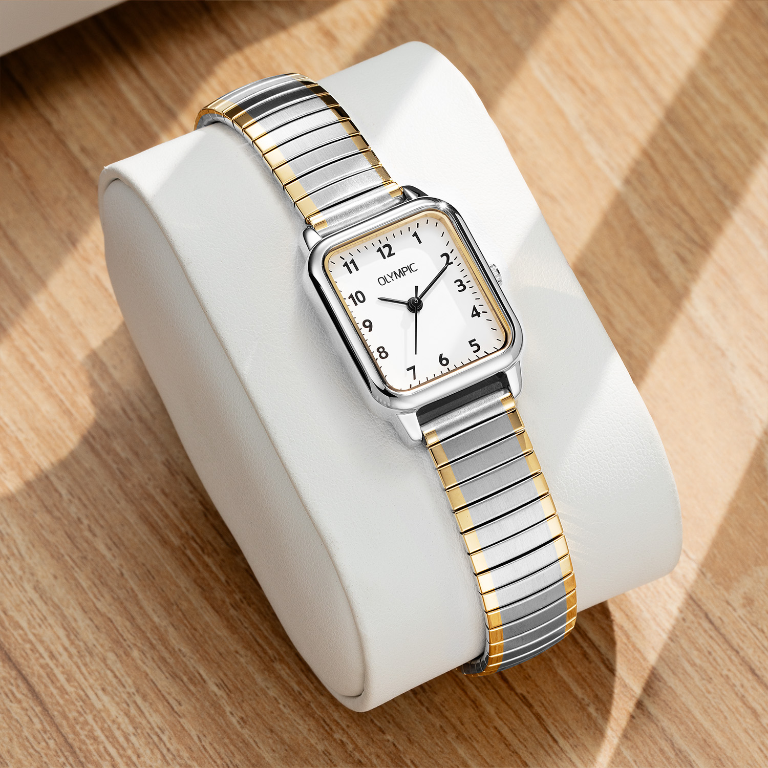 Dit unieke Olympic horloge met artikelnummer: OL26DSS142B is een klassiek dameshorloge. Het stalen rechthoekige kastje heeft witte wijzerplaat met zwarte arabische cijfers en wijzers. Aan het horloge zit een bi-color rekband. Het horloge heeft een mineraalglas, een afmeting van 20.4 bij 23.4 mm en is 5 ATM.