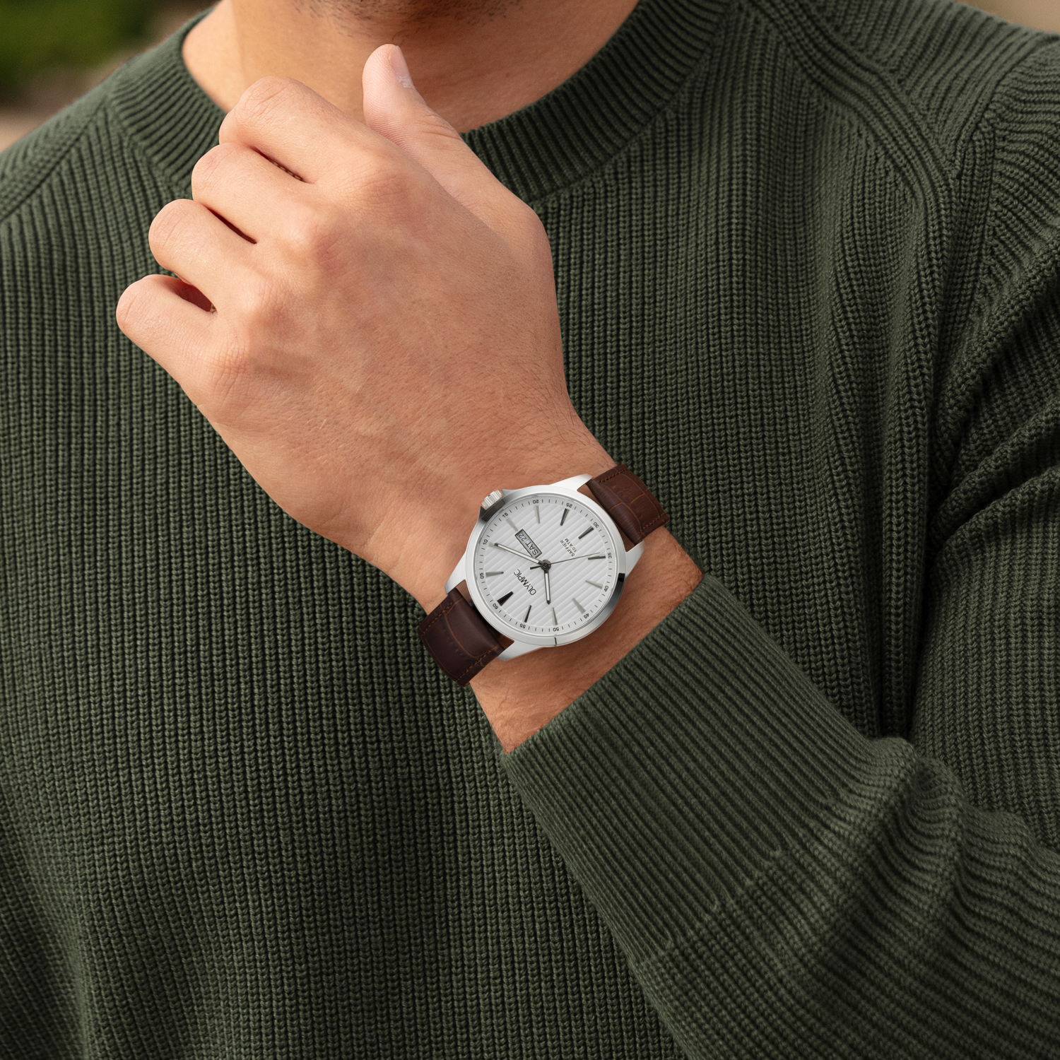Dit unieke Olympic horloge met artikelnummer: OL26HSL077 is een klassiek horloge. De ronde stalen kast heeft een gladde bezel en een zilverkleurige wijzerplaat met een dag,- en datum aanduiding. Aan de kast zit een bruine lerenband met een gespsluiting. Het horloge heeft een saffierglas een doorsnee van 41mm en is 10ATM.