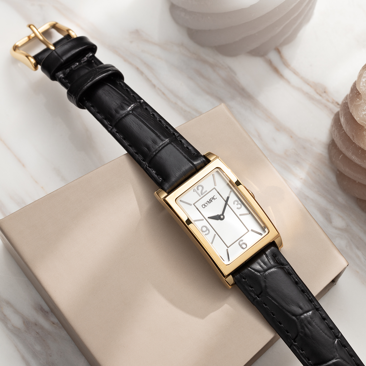 Dit unieke Olympic horloge met artikelnummer: OL89DDL012 is een chique dameshorloge. De goudkleurige rechthoekige kast heeft een strakke bezel en een zilverkleurige wijzerplaat. Op de wijzerplaat zijn de 3, 6, 9 en de 12 in arabische cijfers duidelijk weergegeven en is een rechthoekig kader aangebracht, dit geeft het horloge een klassieke uitstraling. Aan de goudkleurige kast zit een zwarte lerenband met een gespsluiting. Het horloge heeft een mineraalglas en is 5ATM.