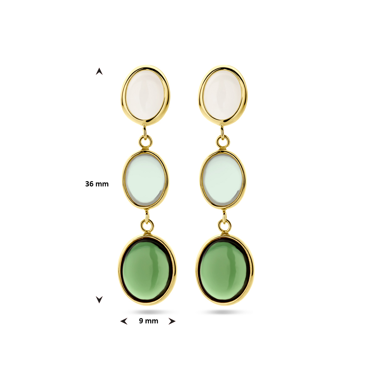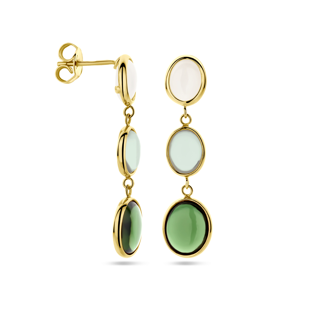 14k Geelgouden oorhangers uitgevoerd met wit aventurijn, groen amethist en groen toermalijn. De oorhangers hebben een totale hoogte van 36mm.