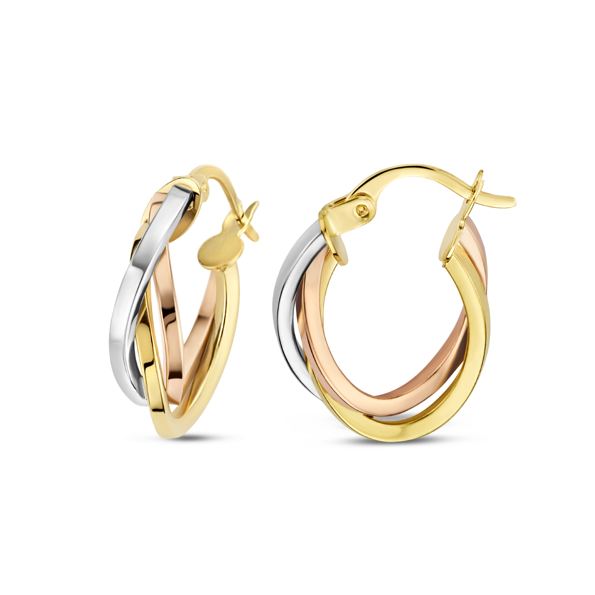 14k Tricolor wit- rose- en geelgouden oorringen met een afmeting van 20.5x5mm.