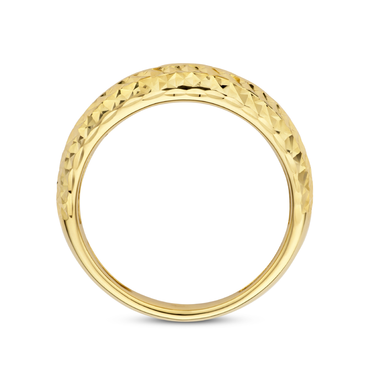 14k Geelgouden ring met een gediamanteerde afwerking. De ring heeft een breedte van 4.5mm. De ring voelt comfortabel aan door de opengewerkte bodem.