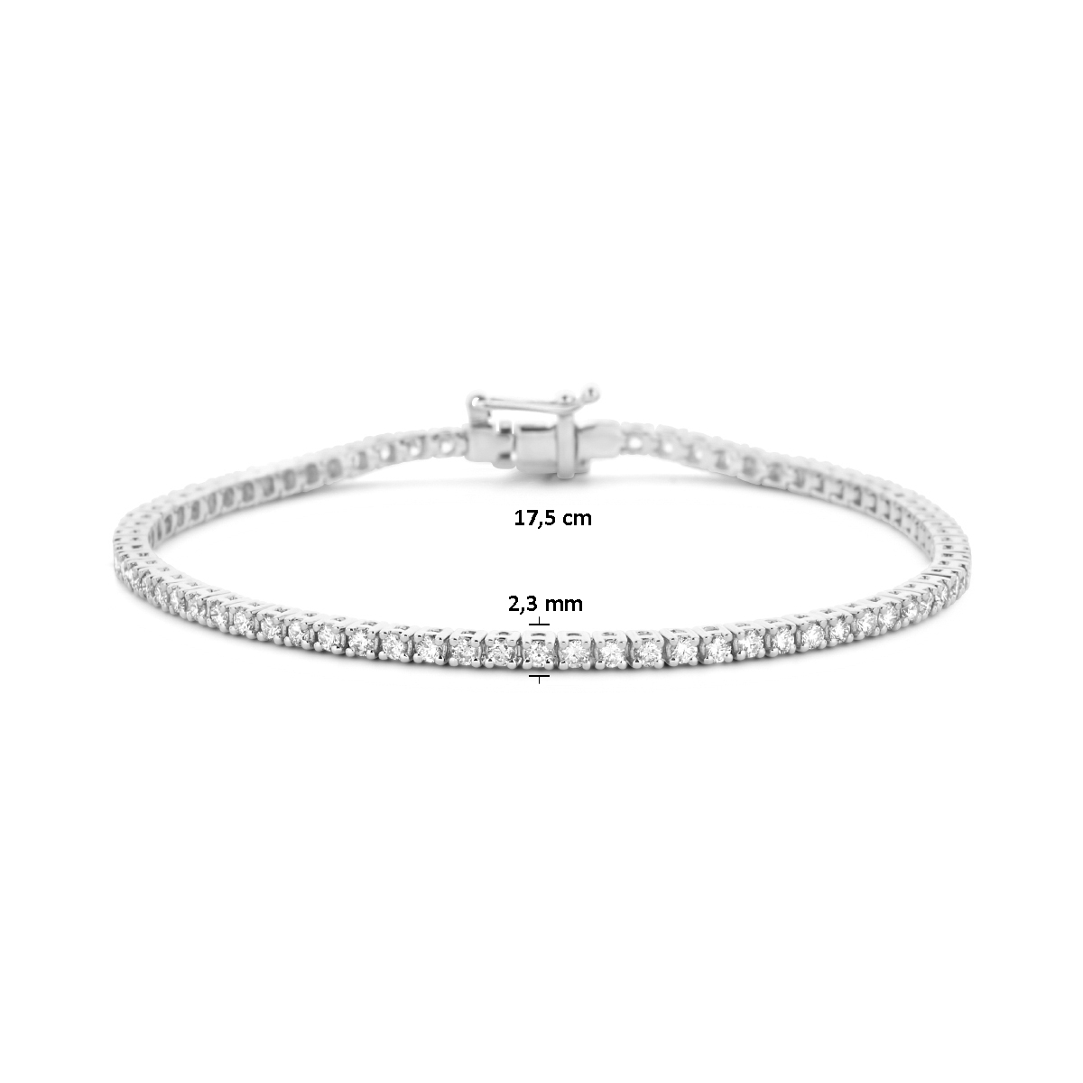 14k Witgouden tennisarmband uitgevoerd met schitterende lab grown diamanten. De tennisarmband heeft een draaglengte van 17.5cm en een schakelbreedte van 2.3mm. Het diamantgewicht is 2.00ct. Lab grown diamanten zijn diamanten die ontstaan in een laboratorium. Onder extreem hoge druk en temperatuur wordt het natuurlijk ontstaansproces nagebootst met als eindresultaat een diamant met dezelfde chemische eigenschappen maar met een andere oorsprong.