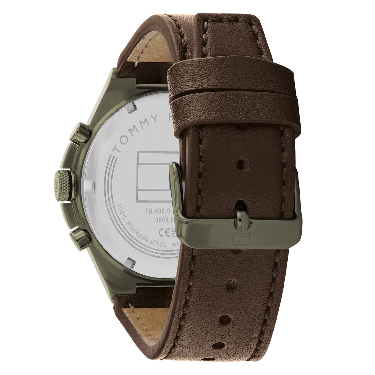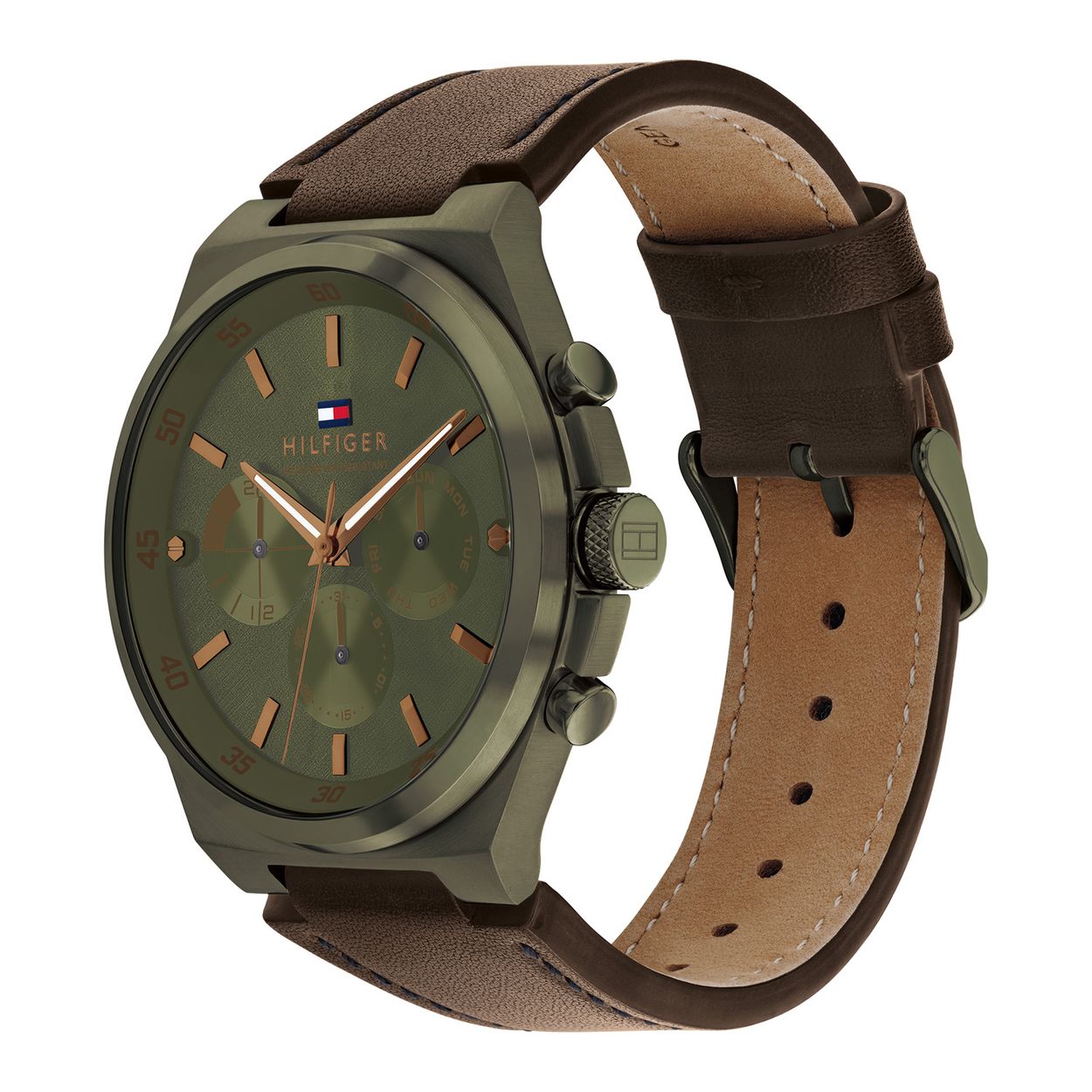 Dit specifieke horloge van Tommy Hilfiger uit de Dexter serie met artikelnr: TH1792085 is een casual herenhorloge die zeker in je collectie past. Het leren herenhorloge heeft een ronde stalen olijfkleurige kast met een gladde bezel en een olijfkleurige wijzerplaat met dag,- datum en 24-uursaanduiding en bruinkleurige wijzers en accenten. De bruine lerenband is op lengte verstelbaar en heeft een gespsluiting. Het horloge heeft een mineraalglas, een doorsnee van 46mm en is 5ATM.
