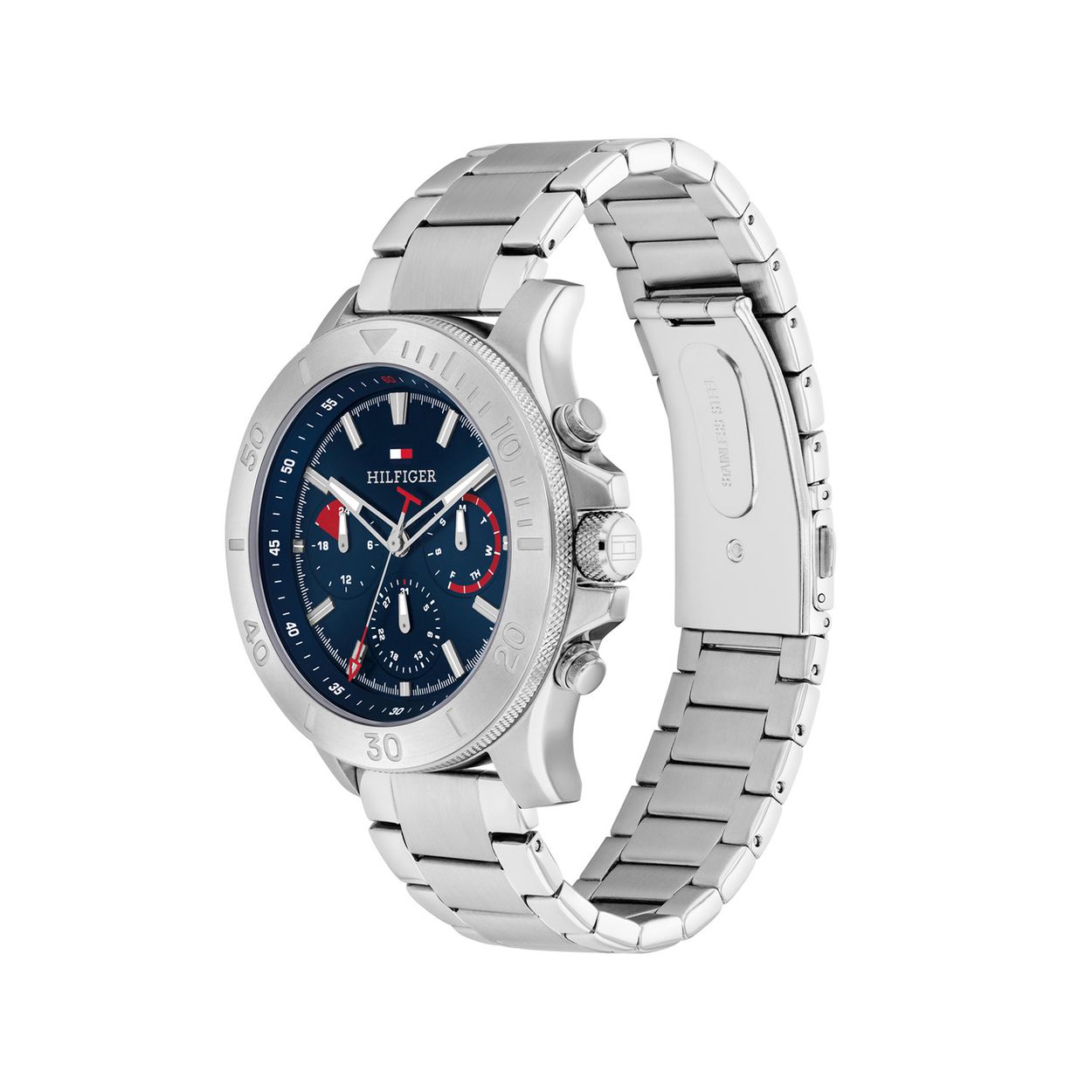 Dit specifieke horloge van Tommy Hilfiger uit de Bryan serie met artikelnr: TH1792113 is een stoer sportief herenhorloge die niet in je collectie mag ontbreken. Het stalen herenhorloge heeft een ronde kast met een blauwe halfglimmende wijzerplaat met dag,- datum, en 24-uursaanduiding en rode accenten. De wijzers zijn ingelegd met lumibrite. Aan het horloge zit een zilverkleurige schakelband. Het horloge heeft een mineraalglas, een doorsnee van 46mm en is 5ATM.